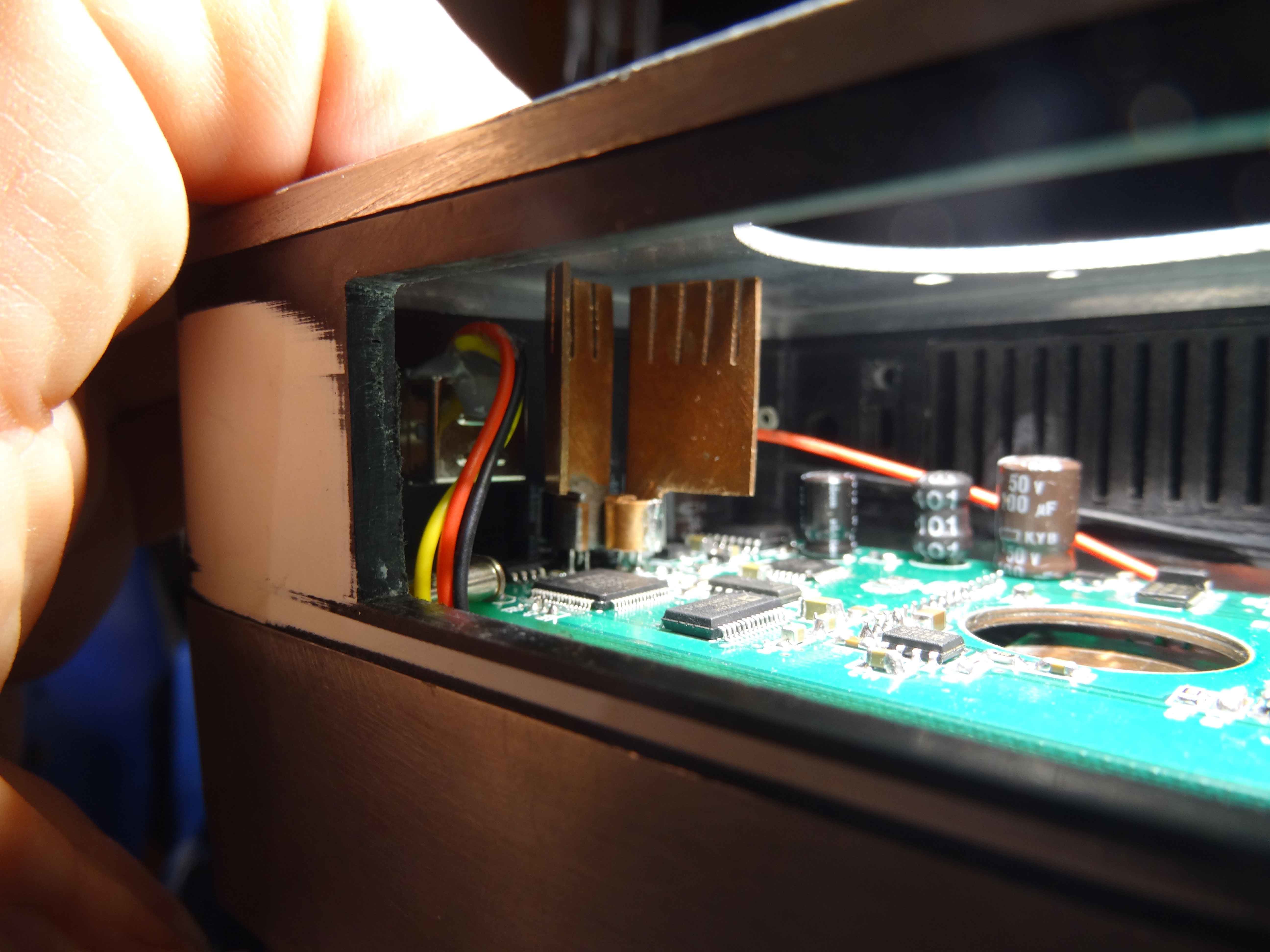 Cale  posée au fond du boitier avant. On voit sur cette photo les pieds pour visser la carte...(vis en nylon). Les deux petites vis intégrées au boitier sont celles du régulateur de tension du Peltier....