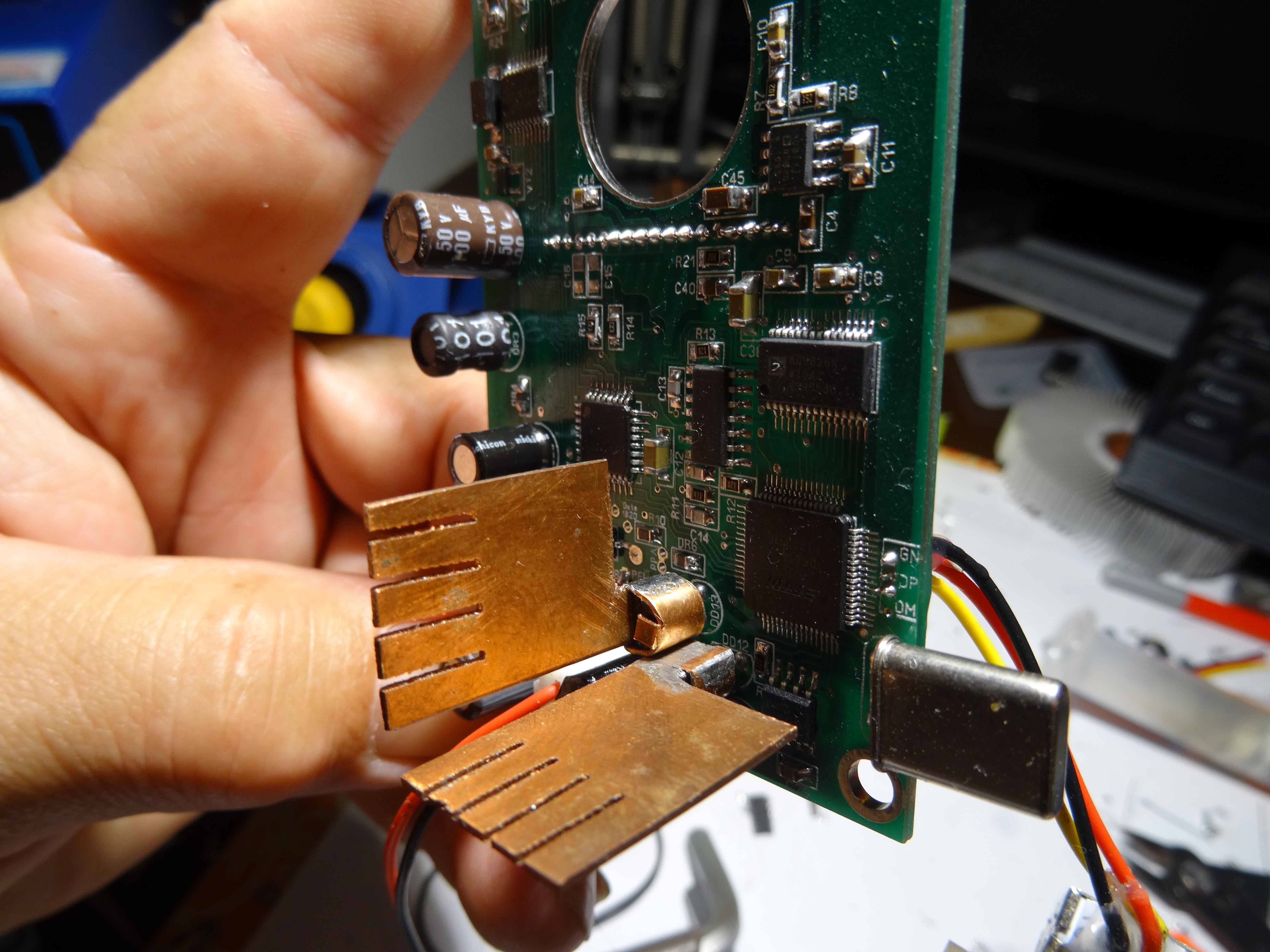 Au début j'avais modifié ma première carte pour y mettre des régulateurs TO220 pour DD11 et DD12. Je suis revenu aux régulateurs "d'origines" mais je leurs ai fabriqué des radiateurs en cuivre....
