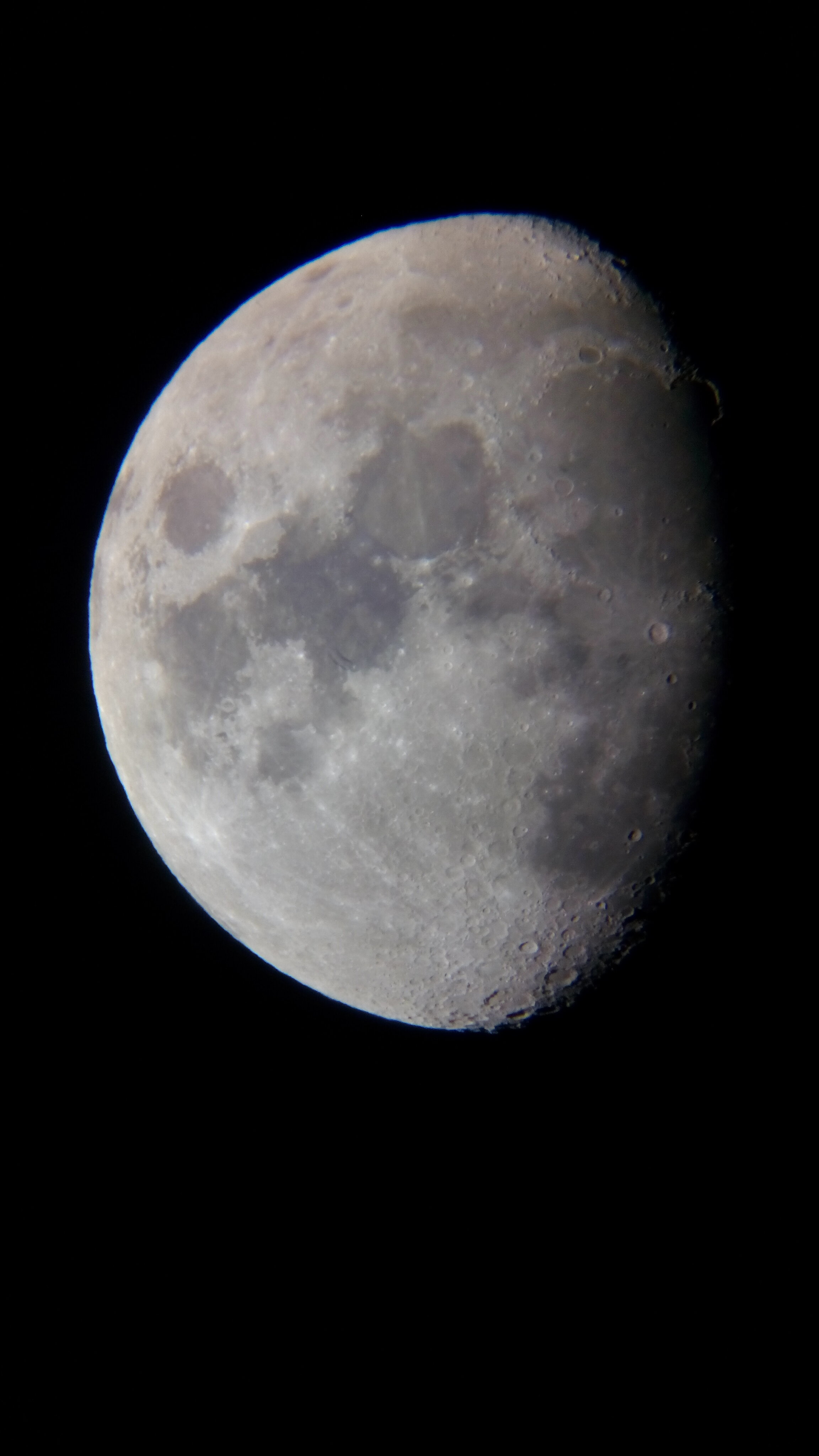 Une Lune gibbeuse croissante d'hier (26/10) prise rapidement entre les nuages au smartphone, en afocale, à mains levées derrière un mak 127 et un WO 20mm 72°. Désolé pour le chromatisme...