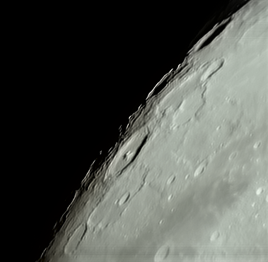 Je vous présente ma première image de la Lune depuis quinze ans prise à partir d'une séquence vidéo AVI sous SharpCap, une minute de vidéo à 30 images/sec. Puis traitement sous Astrosurface. La vidéo a été prise avec une caméra couleur dct35 (2006) modifiée selon les recommandations de Jean-Luc Dauvergne dans un test C&E de l'époque. Du coup, en enlevant les lentilles frontales de la caméra, on se retrouve avec un capteur très sensible aux IR. Or je n'ai pas de filtre anti-IR... La caméra est placé sur le RC de mon mak 127, le tout en manuel sur une Vixen Porta 2. L'image finale a été rognée car il y avait des franges quadrillées dues, à mon avis, aux recadrages manuels du télescope.