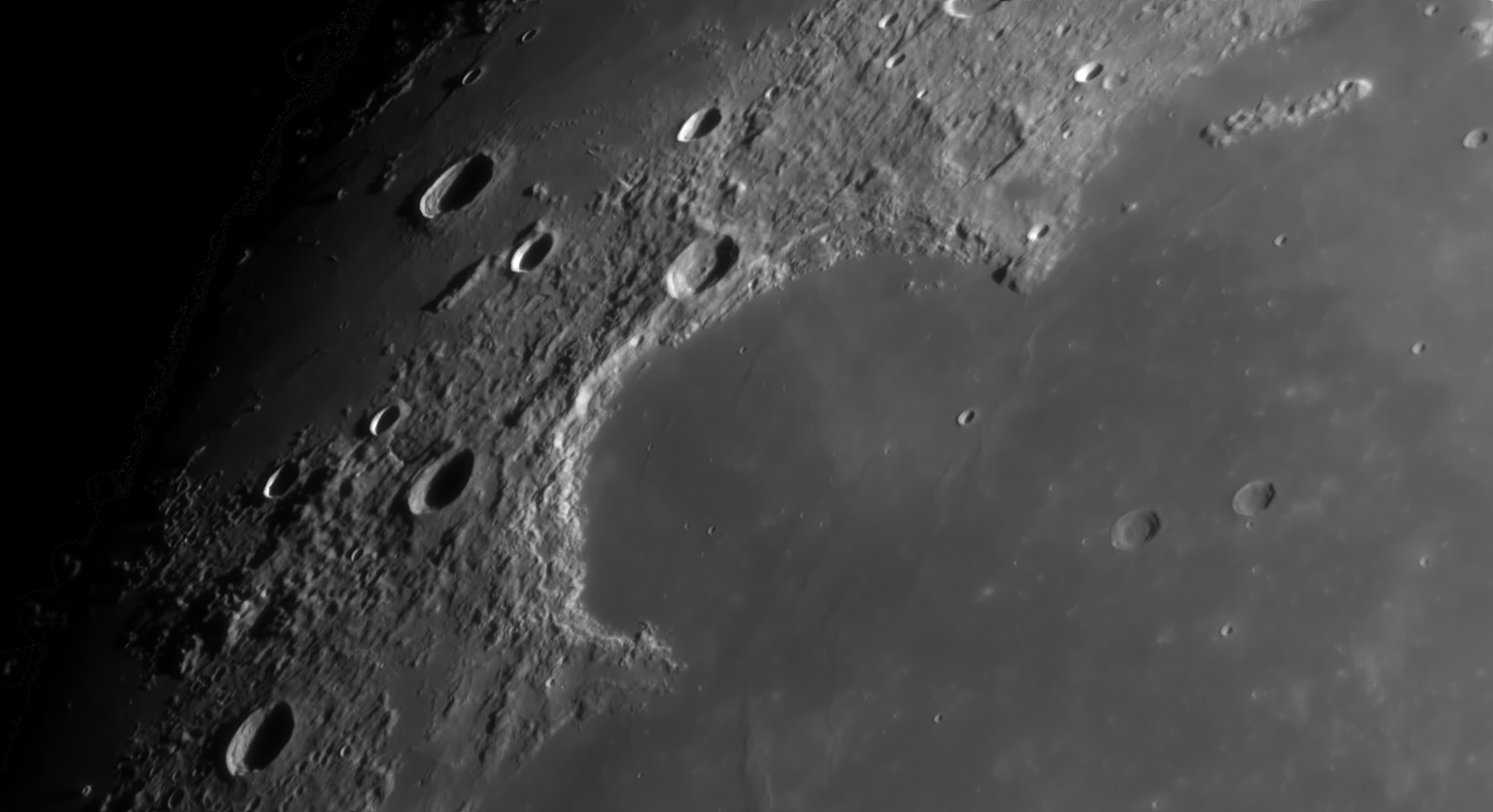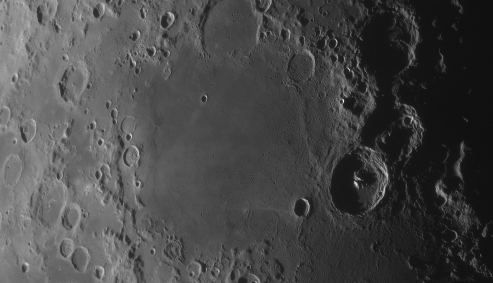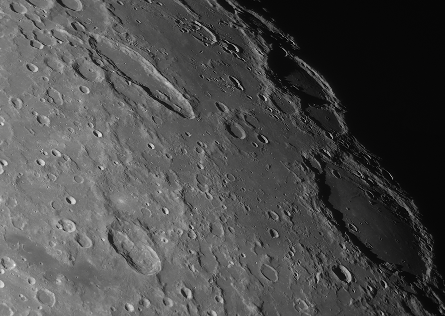 On distingue bien Erodotus en haut à gauche avec le fameux canal, et Schiller (au Sud cratère allongé) et Cassendi (sud ouest). Prise de vue au smartphone mi note 10 sur oculaire 9mm avec bino APM 100 ed. Traitement au smartphone sur LR et j'ai réchauffé un peu le contraste pour que cela colle au mieux avec ce que j'avais à l'oculaire ( c'était magnifique les amis !!!!)
