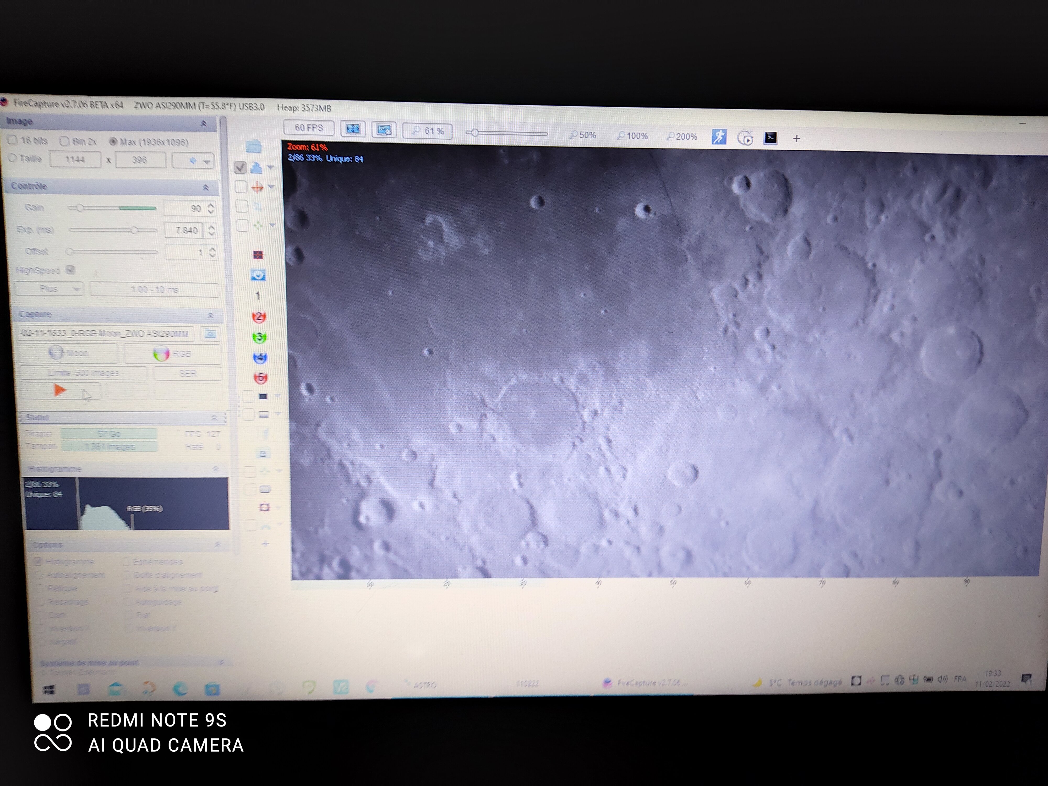 La Lune entière du 11 février 2022 imagée à la lunette Takahashi FC-76DCU sur monture équatoriale Vixen GPD2, équipée de la Zwo Asi 485MC et du filtrte Baader UV/Ir-CutL :