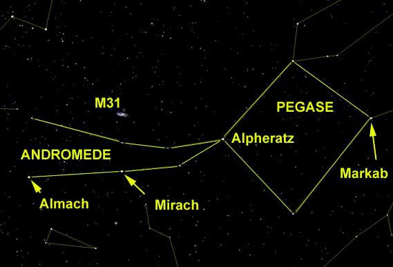 Si tu vois Cassiopée et Pégase, tu vois forcément Andromède ! Il faut acheter une carte du ciel pour apprendre à se repérer, et on en trouve pleins sur le net ! D'ailleurs, en voilà une pour M31 :