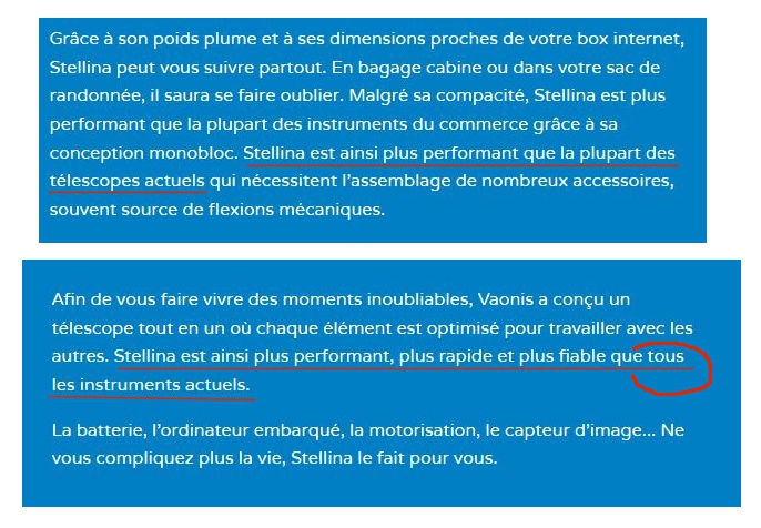 Sinon, concernant ce télescope, j'ai moi aussi l'impression que nous ne sommes pas le public visé. Je ferai donc juste une remarque : la phrase « il va révolutionner l'astronomie et l'astrophotographie », si elle est issue de la publicité de ce télescope (en fait je n'en suis pas sûr ─ cela dit les phrases relevées par Jean-Baptiste au message #64 sont du même accabit), est du foutage de gueule (c'est le même niveau que « lave plus blanc que blanc ») et il y a un risque qu'elle ne rebute pas que moi. Attention avec la publicité grotesque par maladresse. Le Clavius, qui était réellement un bon instrument, en est mort.
