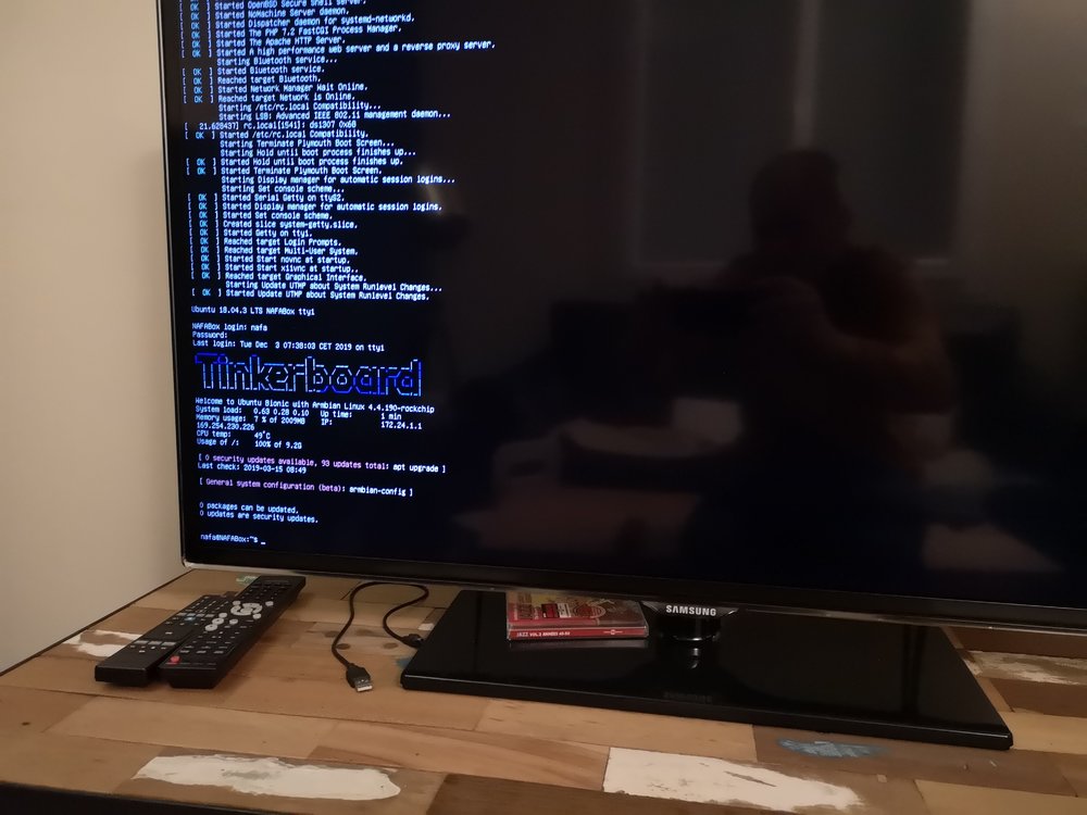 Nous avons pour la partie matériel un carte Tinkerboard, un boîtier pour un PI (la carte à le même format qu’un Pi), une alimentation 2.5 A, un hub USB 2.0 alimenté.
