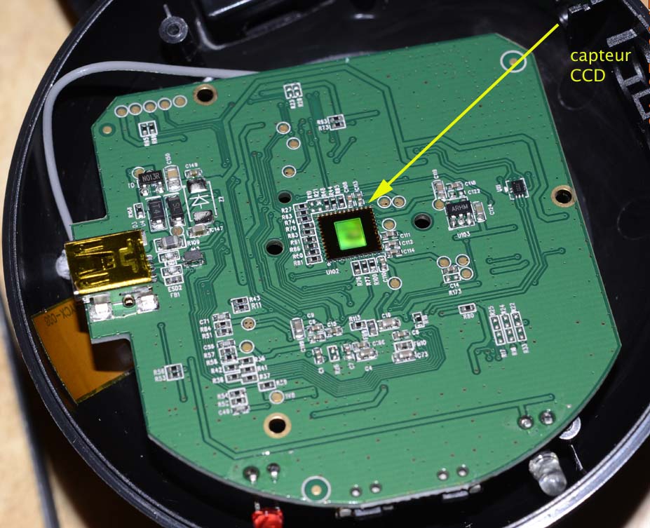 Il y a une lentille de champs qui n'est pas du tout asphérisée (d’où le grand flou dès qu'on s'écarte du centre de l'image!!) et une autre petite lentille collée à un filtre anti IR ; tout ça pour que la cam présente un grand champ !!! et donc grosse perte de définition évidente qui n'est pas liée au capteur mais à l'optique Bresser posée dessus.
