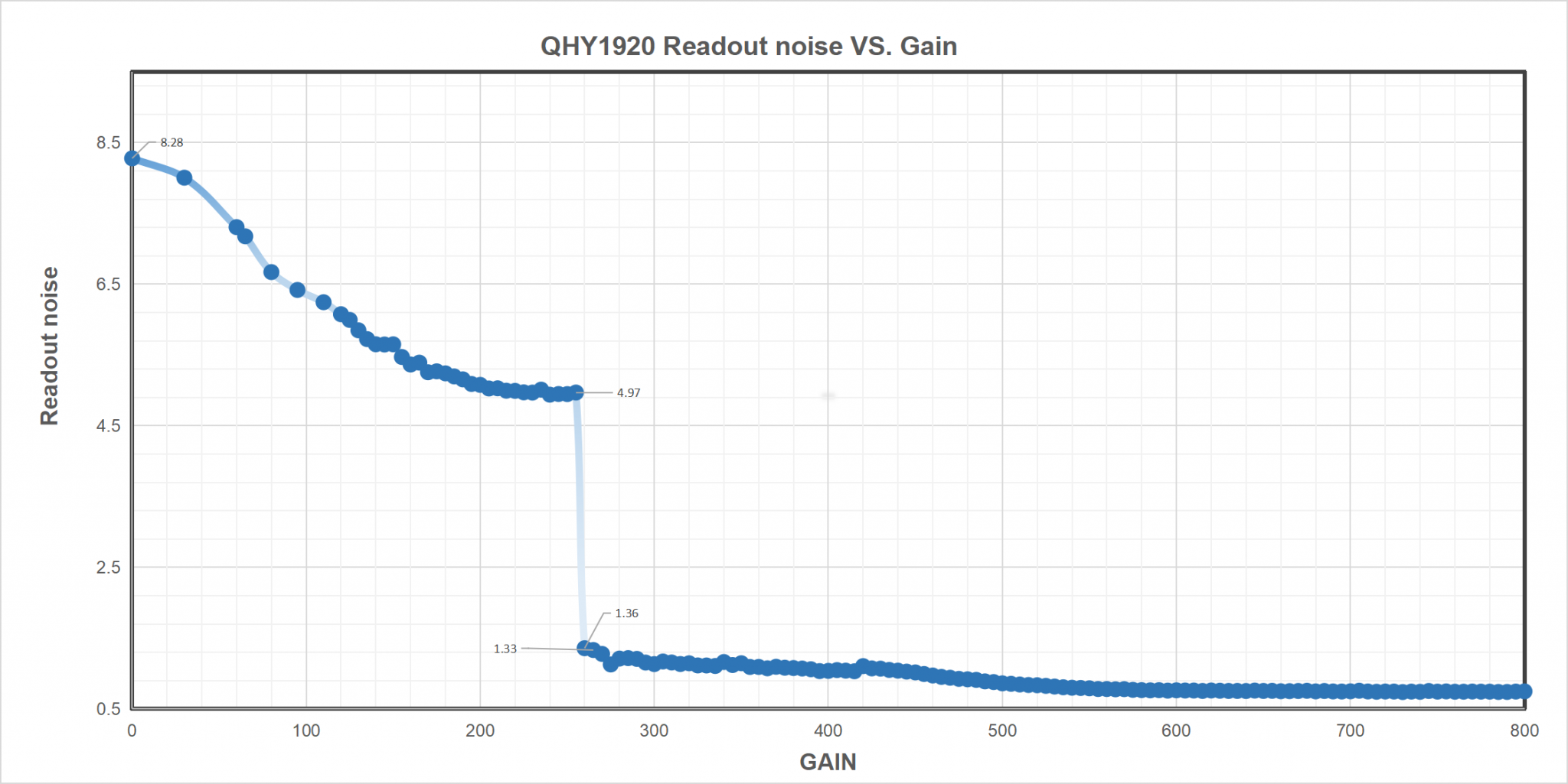 En tout cas j'ai vérifié sur la courbe, la QHY1920 et ses pixels 12 micron descend à 0.8 e- !