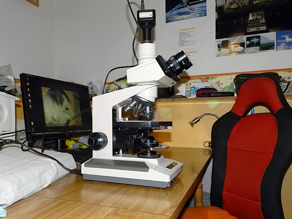 @Papalima   Oui, sur un microscope trinoculaire il y a deux sorties pour des oculaires (comme sur une bino) et une troisième sortie pour recevoir une caméra comme celle présentée ci-dessus.