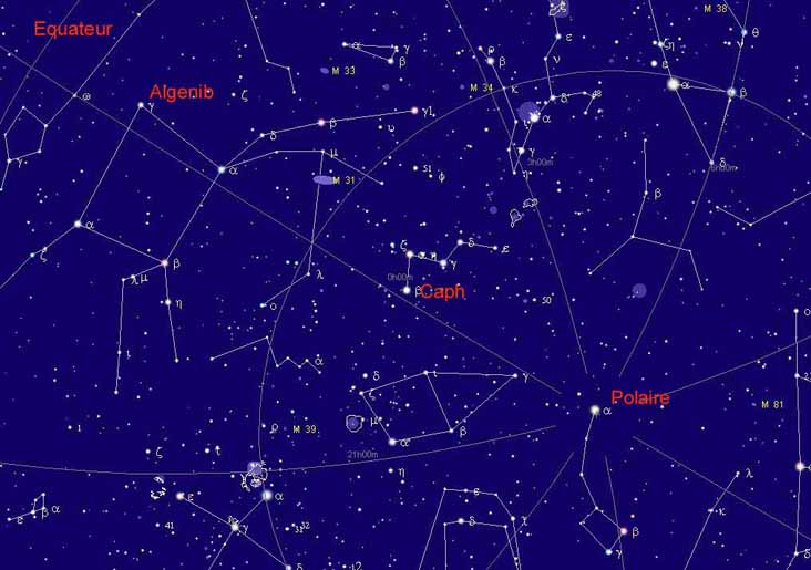 Comme tu peut le voir Algenib est + près de l'equateur (15°) que Caph qui est 59°