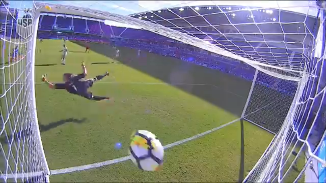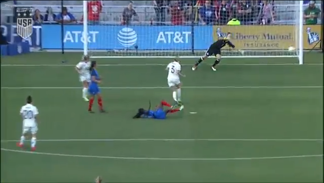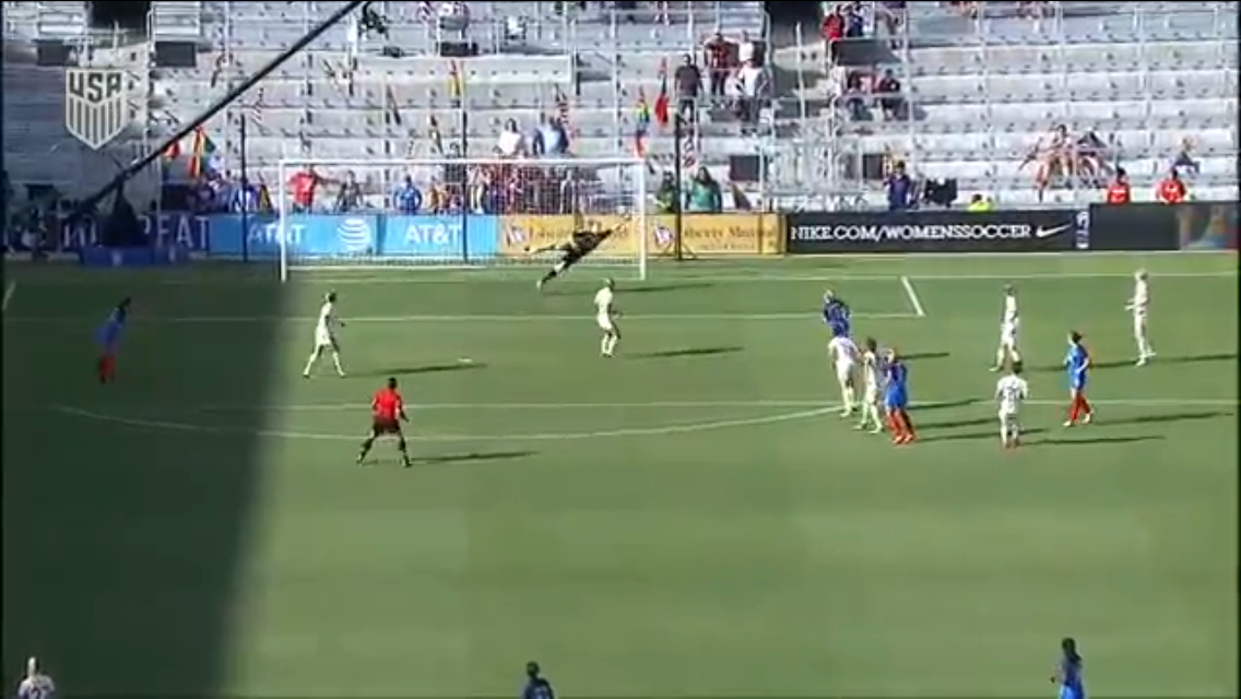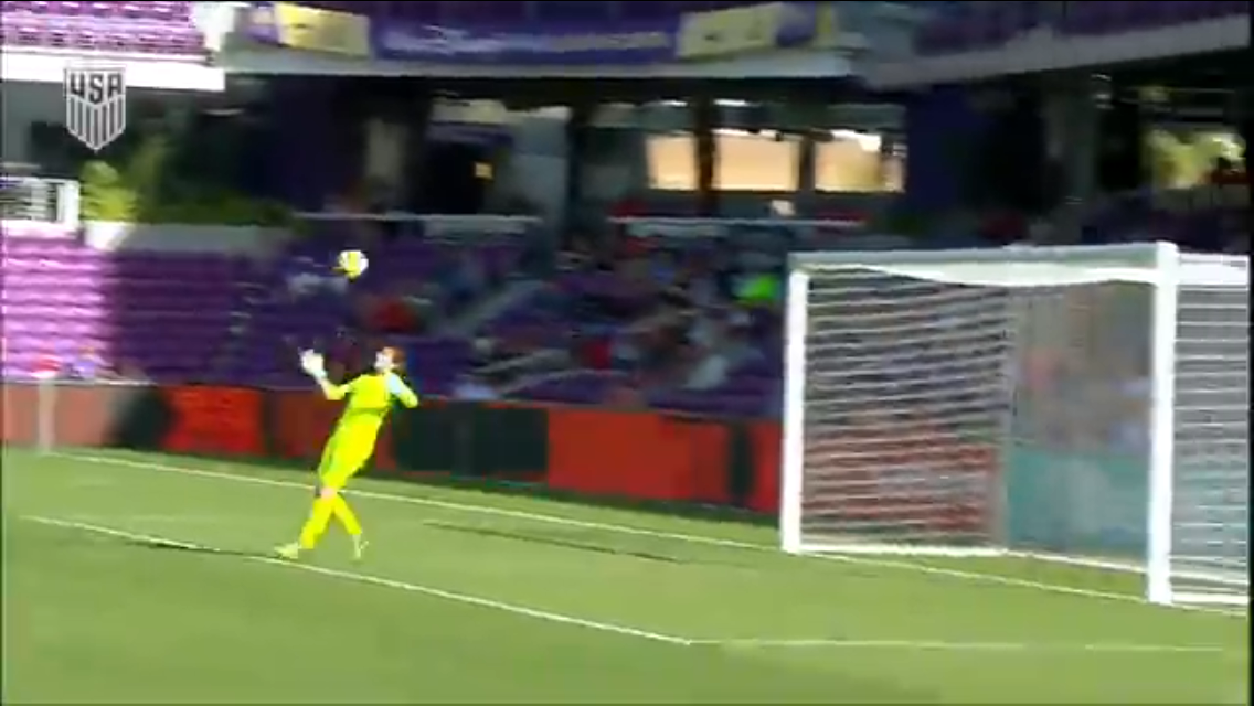 Superbe Sarah qui se dresse de tout son long pour stopper puis ramasser le ballon qui était parfaitement cadré et envoyé tel un boulet de canon
