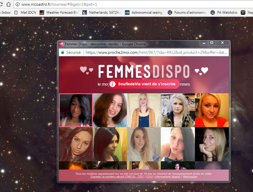 Beaucoup moins sympa, le 'popup' commercial que ta galerie balance aux visiteurs, probablement à ton insu. Tu ferais mieux de stocker tes belles images astro sur la Constellia (pas de compression jpeg supplémentaire jusqu'à 3000px ou 3MB ), ou AstroBin (payant) pour éviter les pubs et la compression (qui dégrade ton image):