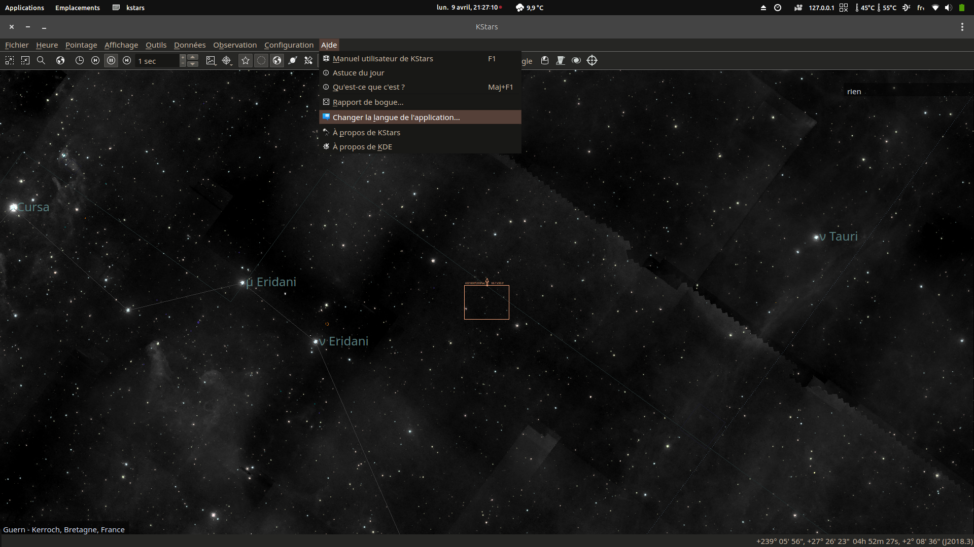 Traou Mad Posté 18 mars 2018 Posté 18 mars 2018 (modifié) Je suis sur ubuntu 16.04 64 bits avec kstars 2.9.3. en français (version issue du dépôt ppa). Si tu es sur linux ubuntu ou ses dérivés, tape cette ligne de commande : sudo apt install kde-l10n-fr Modifié 18 mars 2018 par Traou Mad