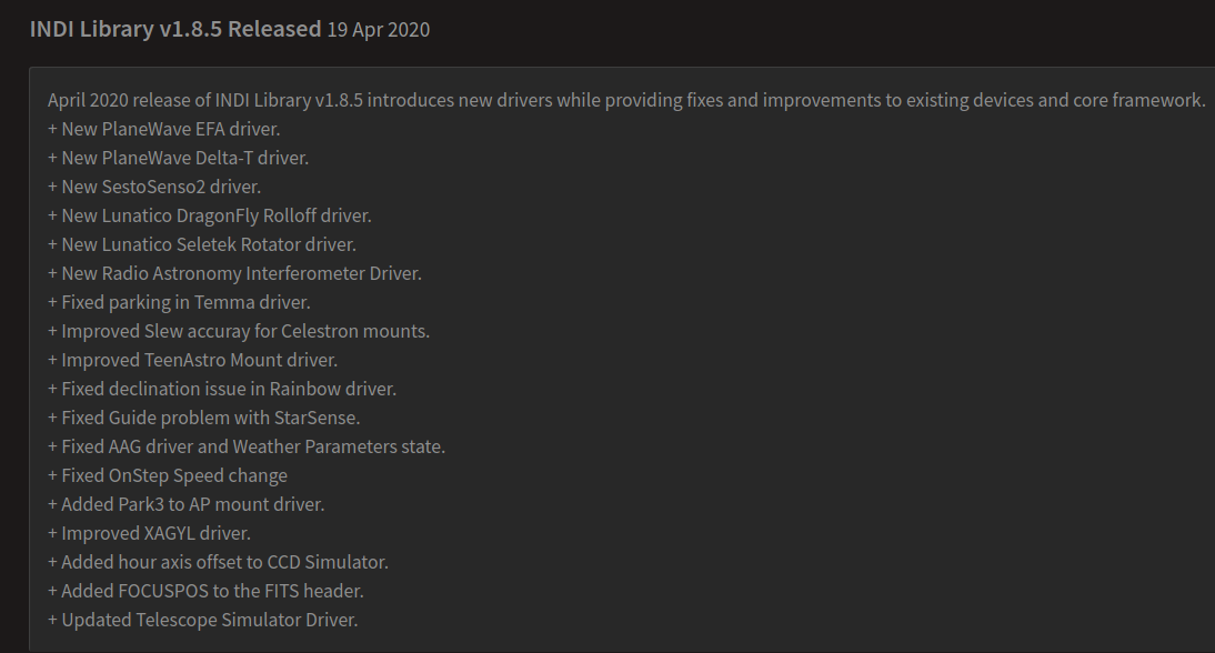 gehelem Posté 11 novembre 2019 Auteur Posté 11 novembre 2019 tiens, je l'ai loupée celle là... Allez zou, on va tester, la MTO s'y prête... http://knro.blogspot.com/2019/11/kstars-v337-released.html En même temps, j'ai vu passer une nouvelle version de la partie serveur+driver qui est passée en 1.8.2 mais on dirait bien qu'elle a disparu ??