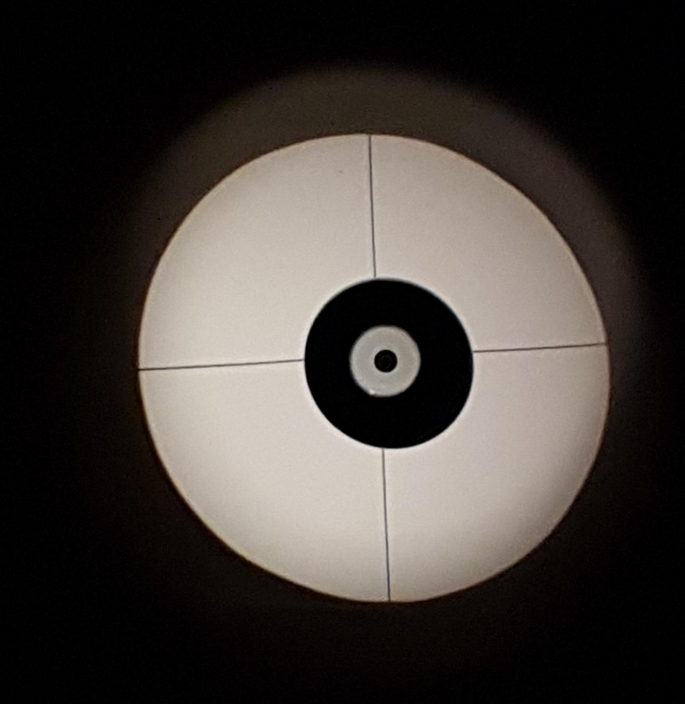 - Je regarde dedans, le reflet noir du secondaire me parait ovale, je dévisse la centrale pour l'orienter et qu'il paraisse rond. Mais le reflet du primaire se retrouve tout en bas à droite dans l'oculaire... je joue donc sur les 3 petites vis du secondaire pour réorienter le tout mais elle redevient ovale et le reflet du cheshire pas du tout au centre de ce "trou noir".