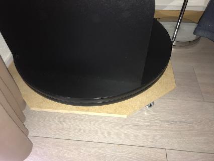 J’ai confectionné pour 17 euros une planche avec 4 roulettes supportant 30kg chacune, j’ai fais découper un panneau de medium en 15mm en carré de 65cm et j’ai coupé les angles pour suivre les formes de la base du telescope, j’ai plus qu’a la vernir en noir