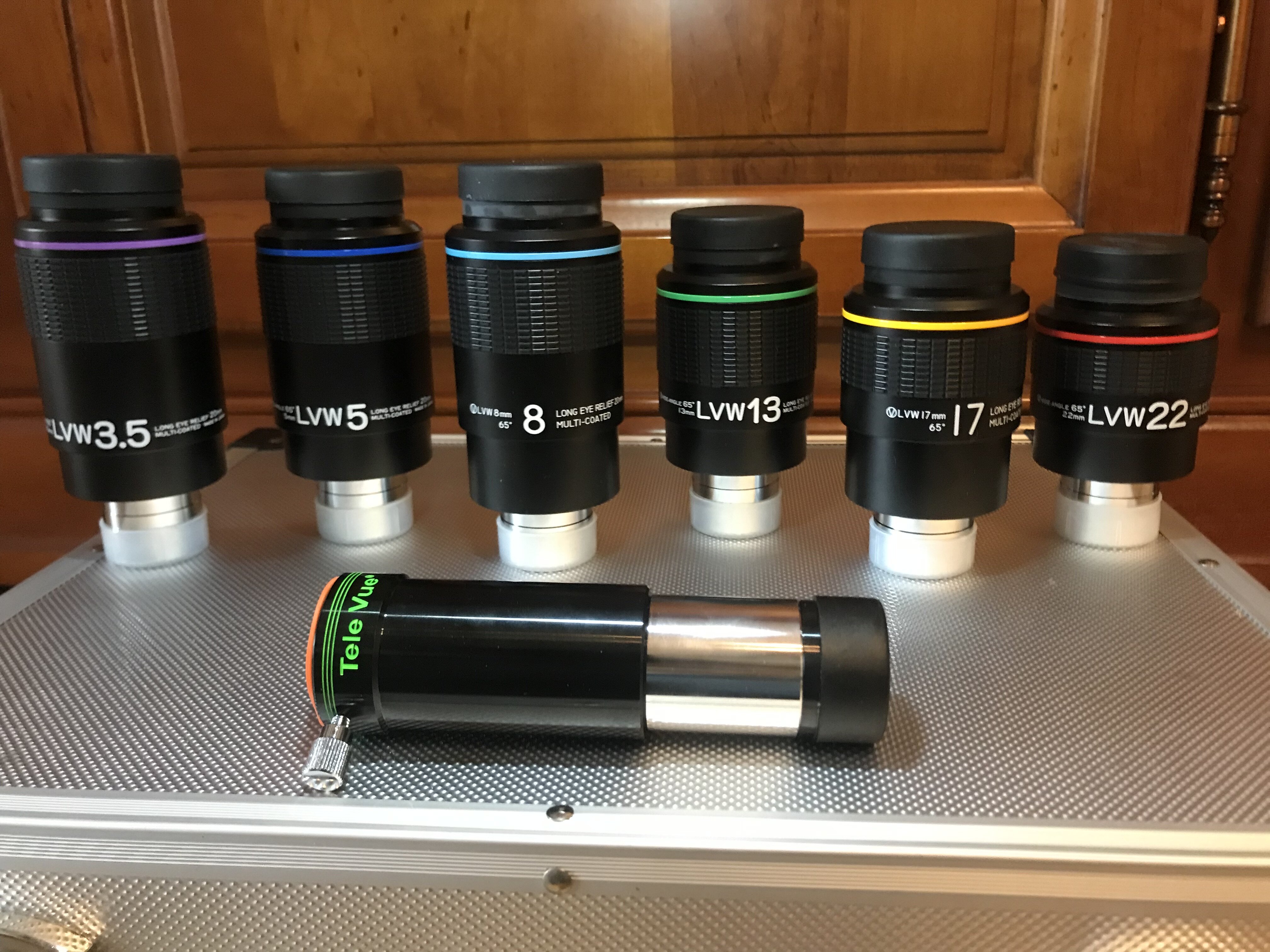 Attention il existe deux séries différentes dans les LVW, vous voyez écrit LVW en gros ou en tout petit (ici par exemple les 8 et 17 qui sont de la première série). Pour celui qui utiliserait ces oculaires en bino il faudrait absolument avoir les deux de la même série car leur longueur pour une même focale est légèrement différente.