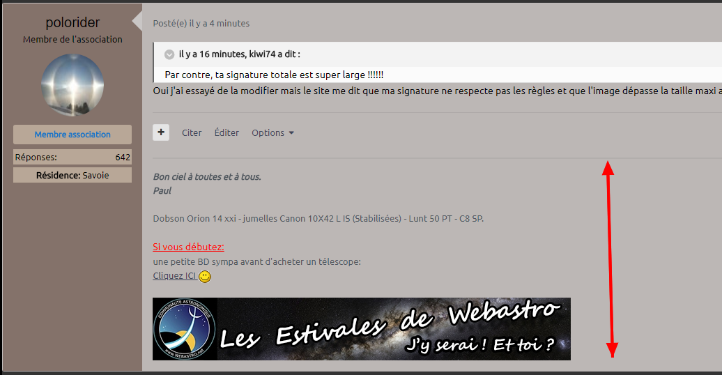 Oui j'ai essayé de la modifier mais le site me dit que ma signature ne respecte pas les règles et que l'image dépasse la taille maxi autorisée...
