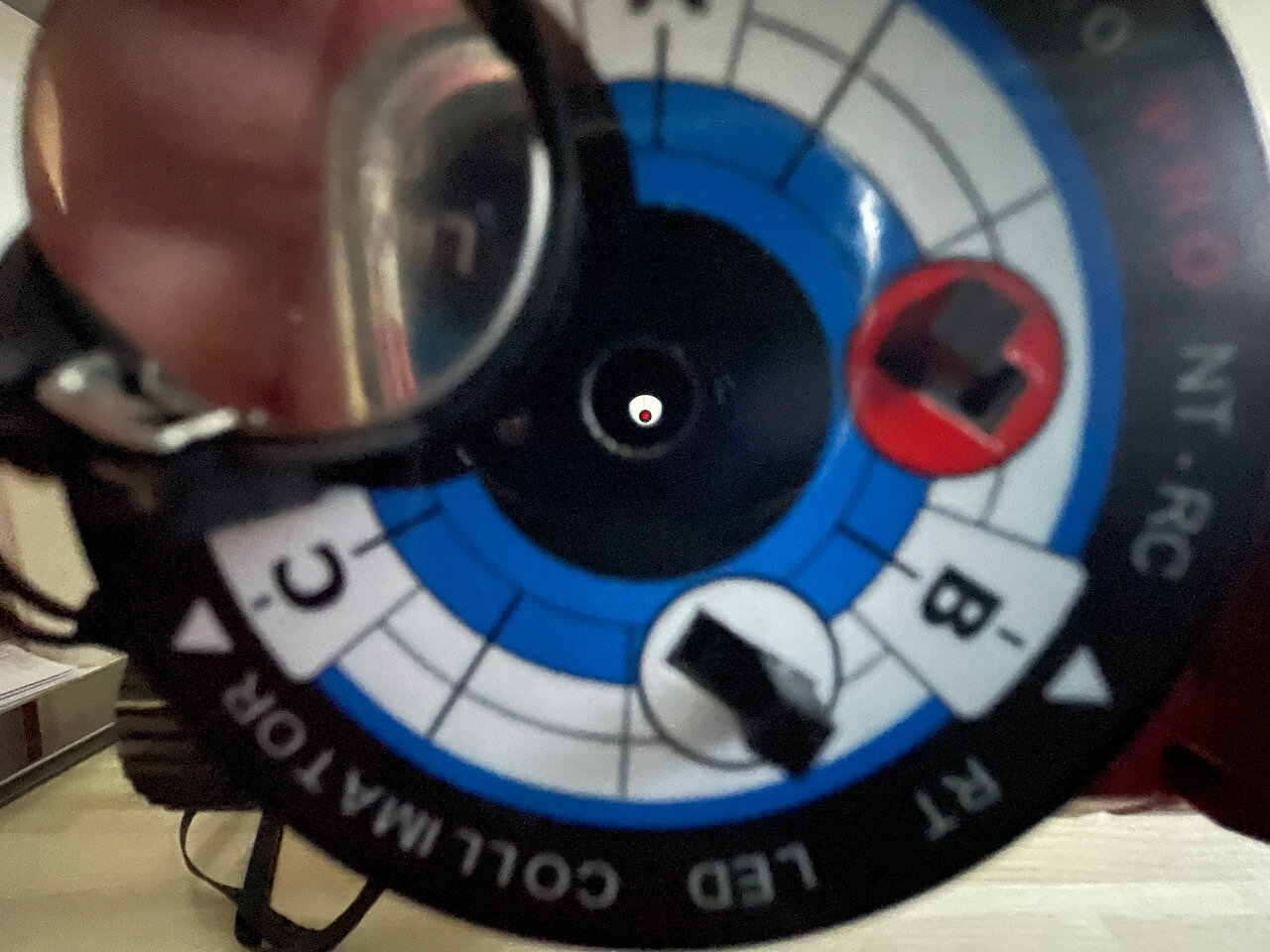 En fait il y a un oeilleton central. Tu allumes le petit bouton à droite de la lettre B pour un réfracteur, qui projette 4 leds blanches en croix, ça créée une première réflexion sur la première lentille et d'autres sur les lentilles suivantes (double et triplet). Si une des lentilles n'est pas alignée la projection en croix ne sera pas symétrique.