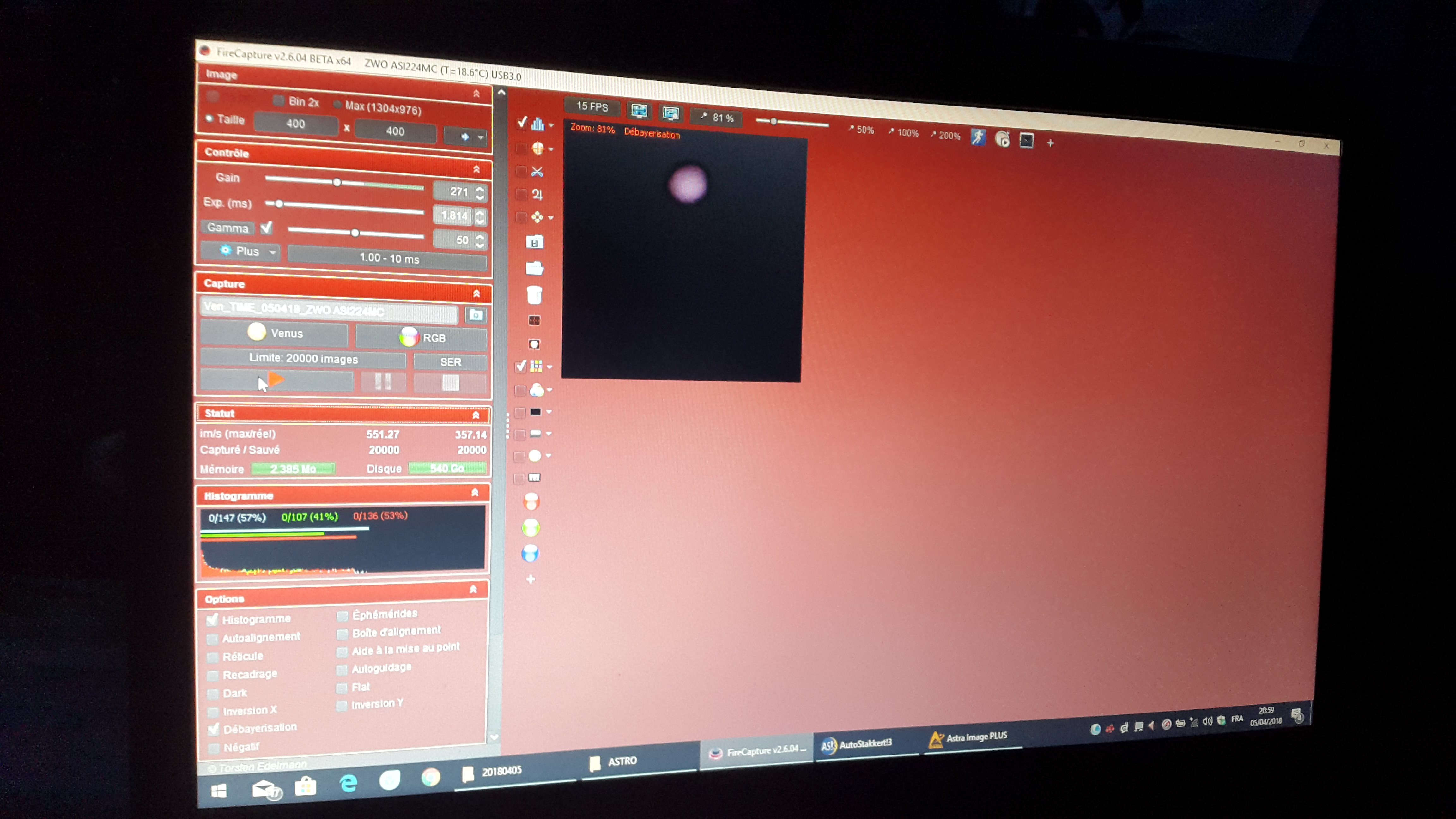 Avec le C8 Celestron, barlow Antares 1.6x, Adc Zwo,  Asi224mc, avec filtre Ircut, filtre IR 742nm, filtre W47 violet.