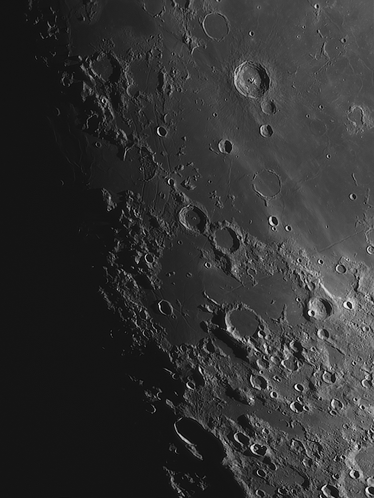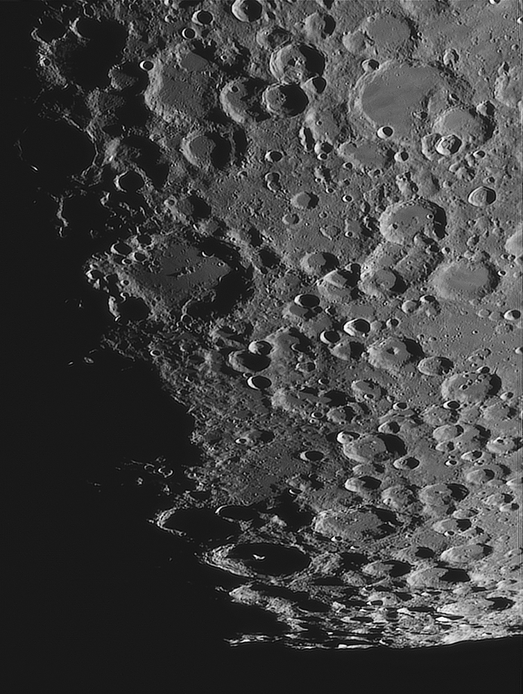 " ....L'image au premier abord semble très propre, détaillée mais arbore un chromatisme évident sur le bord, bien que nettement moins dramatique que ce que j'imaginais. Mes amis ont eu alors la brillante idée d'utiliser un filtre polarisant variable. Le filtre (je devrais plutôt écrire philtre tellement la chose semble magique) efface le chromatisme et la Lune nous présente aussitôt un visage des plus neutre qui ne nous brule plus la rétine. Nous poussons alors progressivement à 75x toujours avec le filtre polarisant. Les détails sont réellement bluffants sur la partie du terminateur la plus contrastée, le chromatisme toujours bien maitrisé. Un essai à 150x prouve les limites du filtre polarisant tout en éliminant quand même la majeure partie du halo coloré (un fin liseré violet est décelable sur le bord des cratères). La finesse est bien là et on arrive à deviner des nuances de couleurs sur le bord de la mer des crises ainsi que de petits cratelets......"