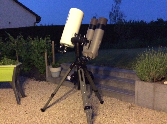 Du jardin : Mewlon 210 sur  AYO II digi  avec jumelles APM 100mm  45° ED -apo en parallèle sur Berlebach Uni 19 C .
