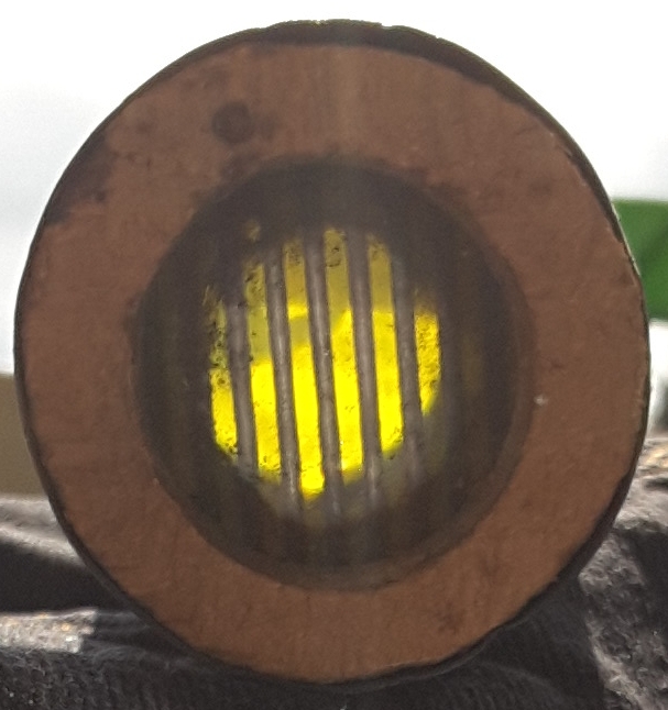 alaindumercantour Posté 5 juin 2018 Posté 5 juin 2018 Voici ensuite le bouzin pour grande Lunette de Meudon : laiton longueur 172 mm diamètre 43 à 45 mm selon déformations, liège pour tenir lentille jaune et les 7 tiges parallèles servant de cache ou grille verticale (où horizontale ou oblique hein...), sorte de diaphragme coulissant avec lentille à l'autre extrémité. Poussière d'époque dans son jus. Rôle inconnu. Suis bien sûr intéressé par tout renseignement sur ce bricolage expérimental de la mort qui tue !