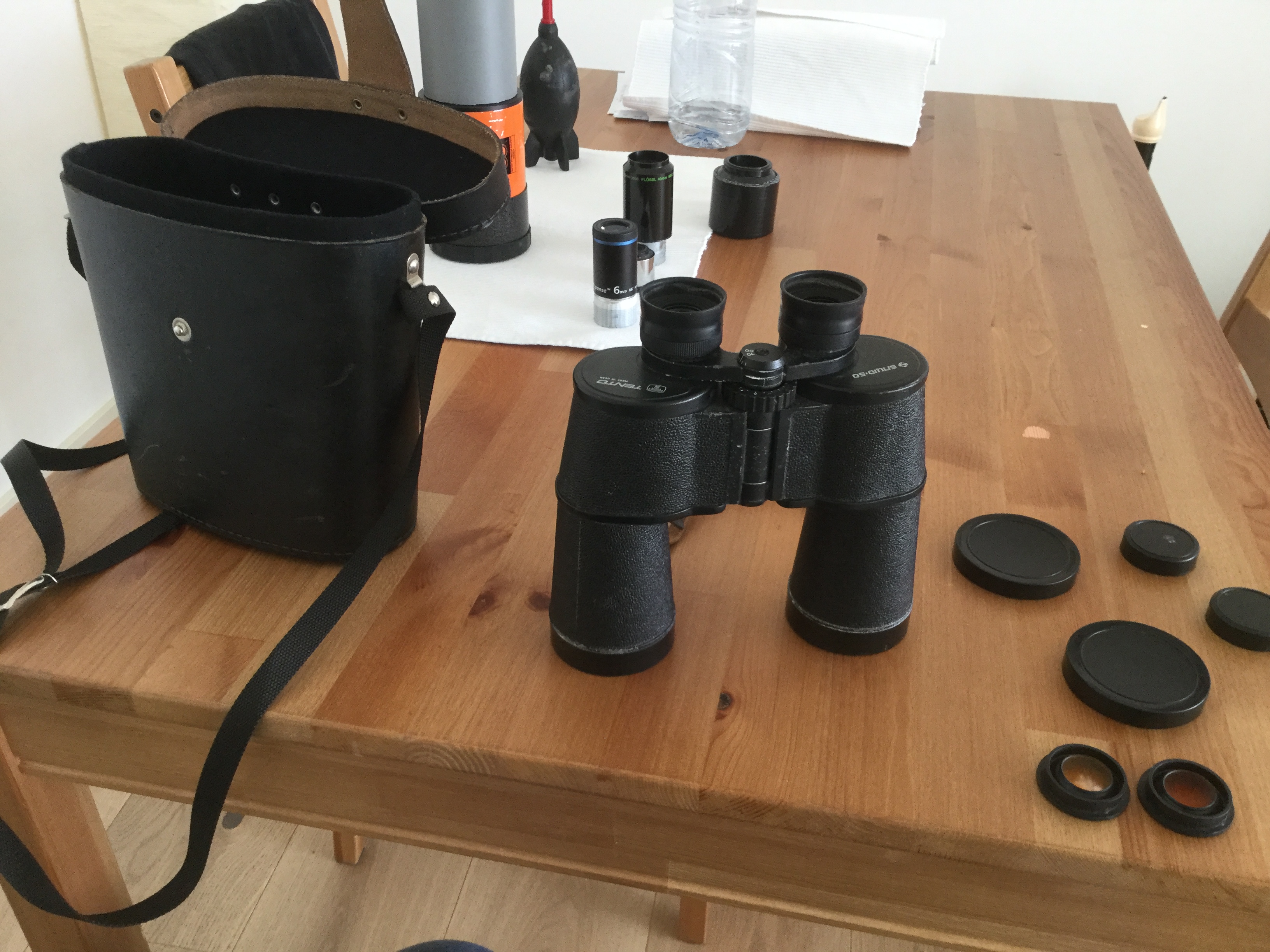 lambda Posté 6 juin 2018 Posté 6 juin 2018 (modifié) Bonjour à vous! 🙂 Et encore merci à toi Kiwi, pour cette nouvelle initiative! Je sens que ca va être très sympa et aussi très instructif! Ma petite contribution ici vous est présentées.... le contexte: création d un petit set up nomade épuré conçu dans l aura de la Sainte Trinité suivante: Back to the basics, Do it yourself Low budget.. Et la, la récupération vintage fait clairement des malheurs... brocantes, greniers, épaves de la poque argentique, vieille optique indus... Tout d abord 1er élément de ce setup, une paire de jumelles qui vient delà famille de ma femme qui est polonaise, cette paire de jumelles appartenait à son père qui nous a quitté il y a 3 ans....donc c est aussi un souvenir precieux pour nous... Ce sont des 10X50 fabriquées dans l ex URSS, de marque Tento. Très sympas, image piquées sur une grande partie du champs, chromatisme bien contenu. Image aux couleurs un peu « Chaudes », à savoir avec une légère prédominance jaune.... assez caractéristique des productions optiques soviétiques de l époque... traitement anti reflet bleu-violet. J ai observé Jupiter et la danse de ses satellites hier soir, très très joli, ainsi que quelques champs d étoiles pour un premier test.... avec leur pupilles de sorties de 5 mm, et sous un bon ciel noir, ça va dépoter je pense... Elles ont bien 30 ans d age au moins.... un chouette vintage en tout cas, je trouve... a+, Lambda Modifié 6 juin 2018 par lambda