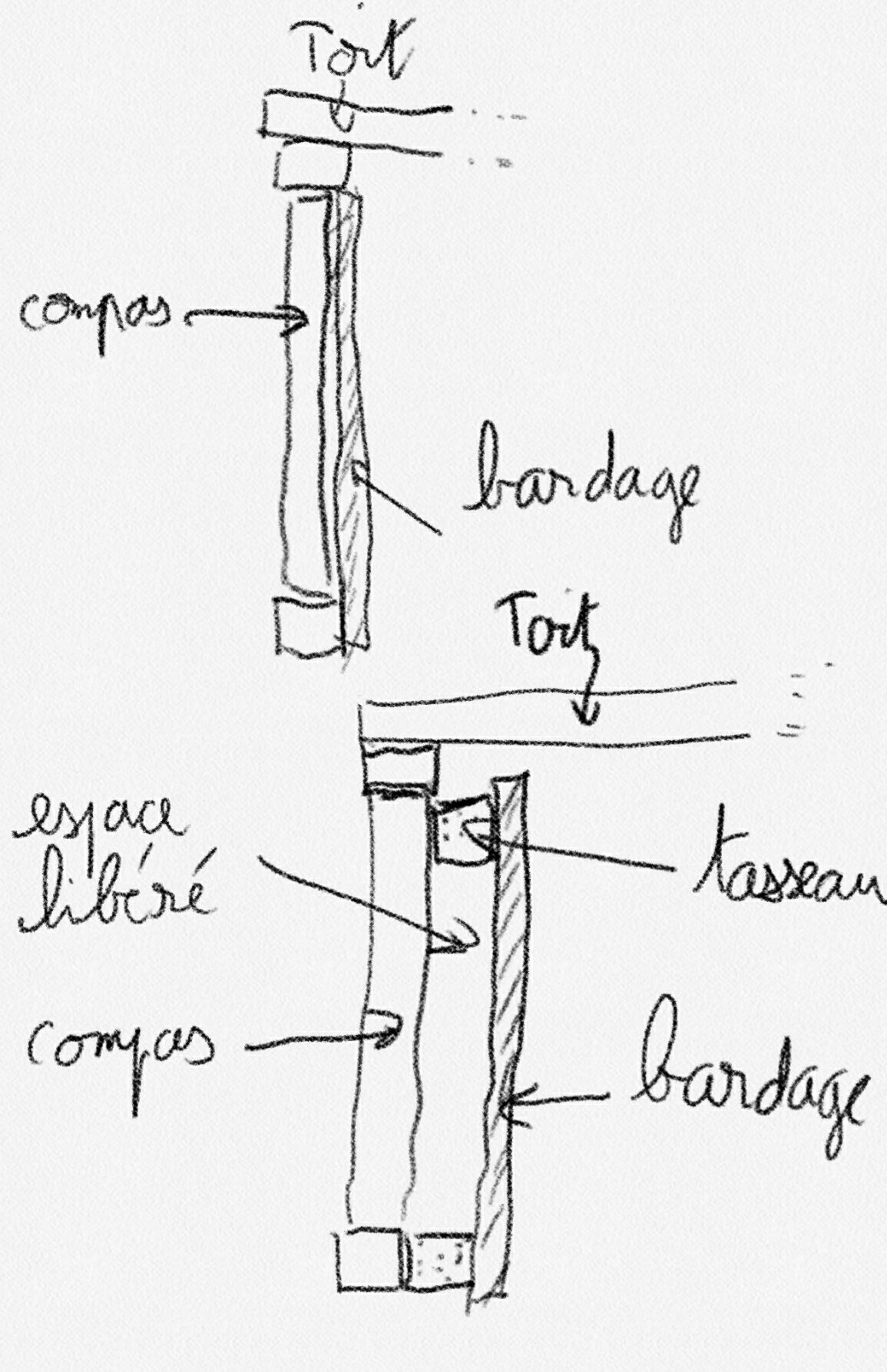En coupe.... en haut actuellement, en bas pour pouvoir passer la chaine et les tendeurs de mon schéma précédent entre les compas et le bardage en gardant un guide latéral pour minimiser le balan latéral