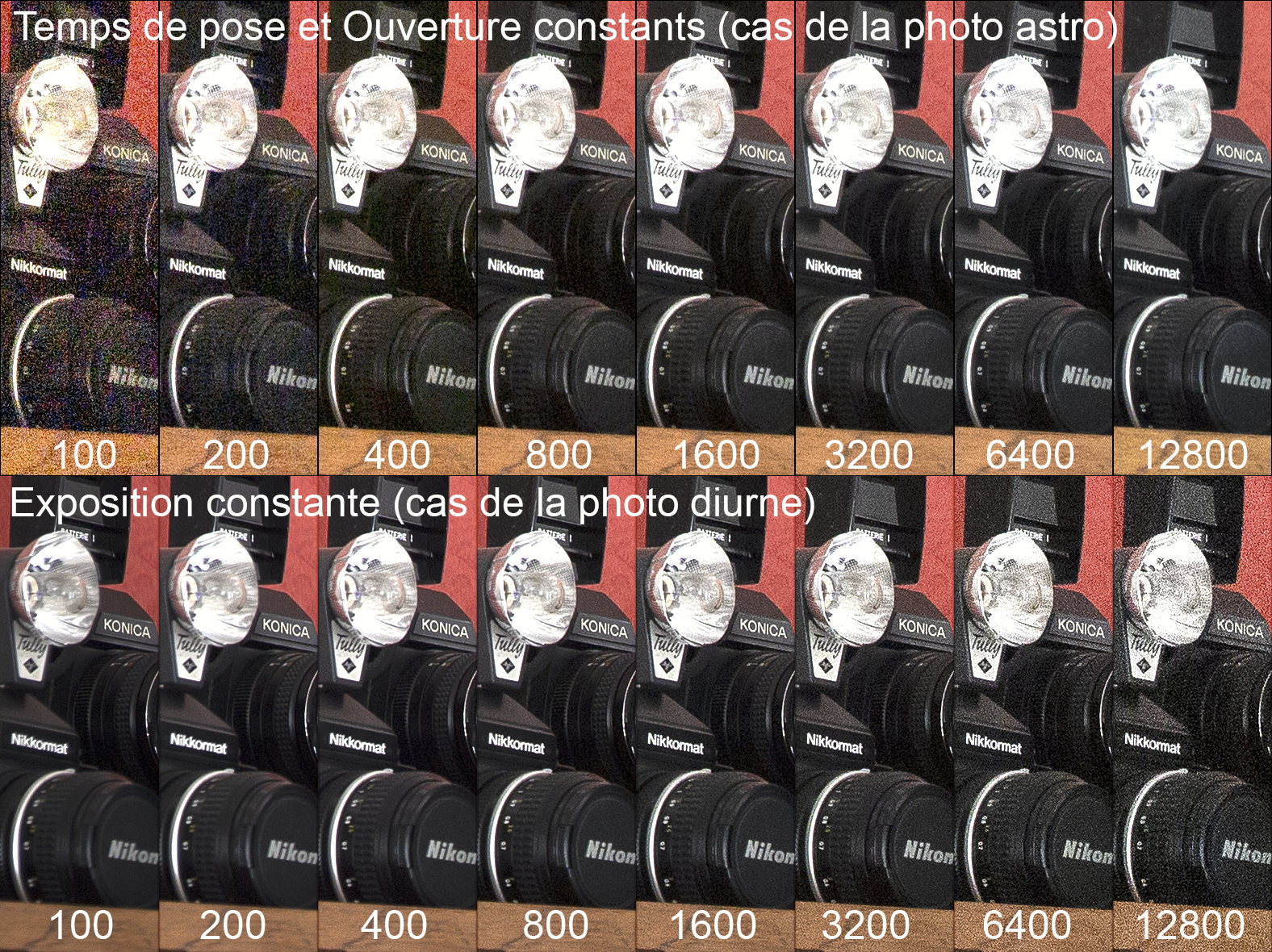 Fred_76 Posté 9 mars 2021 Auteur Posté 9 mars 2021 En usage astro, on a généralement un temps de pose constant, qui dépend surtout de son fond de ciel et de la capacité de suivi de son matériel, par exemple 180 s, 300 s... L'ouverture aussi est constante, le télescope ou la lunette n'étant pas équipés de diaphragme. Dans ce cas, le seul paramètre qu'on a est le réglage du gain, donc des ISO sur les APN. En usage diurne, les objectifs disposent d'un diaphragme et ont toute latitude (ou presque) sur le temps de pose. On ajuste donc temps de pose et ouverture en fonction des ISO pour une exposition convenable. Dans les deux cas, l'évolution du bruit est complétement différente. En astrophoto, avec un APN qui n'est pas ISO-invariant comme le 6D (quoiqu'au dessus de 800 ISO, il est difficile de faire la différence), le bruit diminue quand on augmente les ISO. En diurne c'est l'inverse ! Avec un boitier ISO-invariant, le constat aurait été différent : le bruit serait resté le même sur tout un ensemble d'ISO, par exemple de 400 ISO à + sur le Nikon D850. On aurait alors intérêt à rester à 400 ISO dans tous les cas sur le D850. En photo de paysage de nuit, on est à mis chemin entre les deux usages. On a une petite latitude sur le temps d'expo et l'ouverture. On choisira donc un réglage ISO qui offre une bonne dynamique et qui minimise le bruit. Pour le 6D, c'est entre 1600 et 6400 ISO qu'on est bien, au delà, la dynamique est trop faible, et il faudrait cumuler beaucoup d'images, mais ce n'est pas inutile de l'envisager en cas de ciel extrêmement pur, sans Lune et exempt de PL.