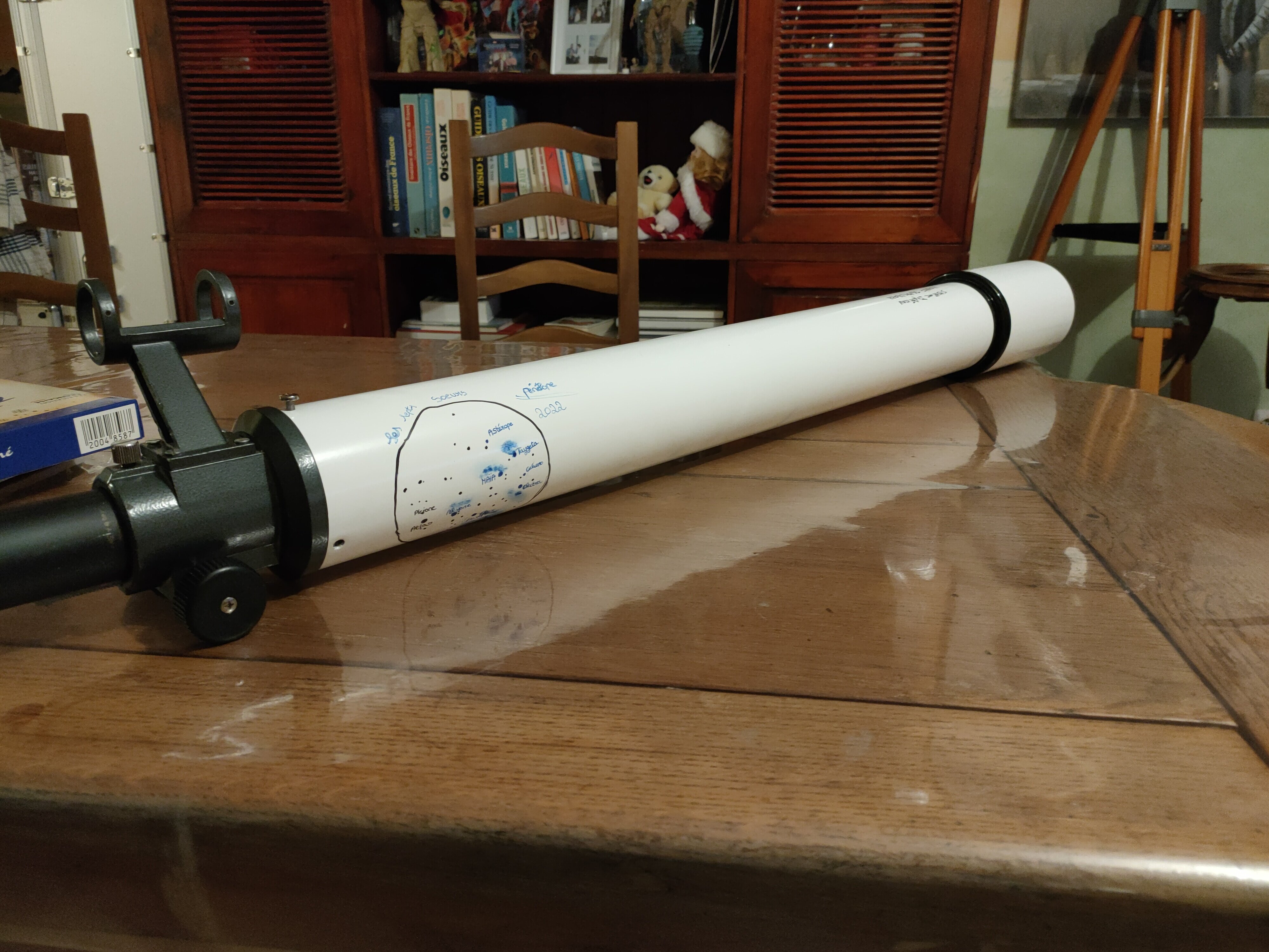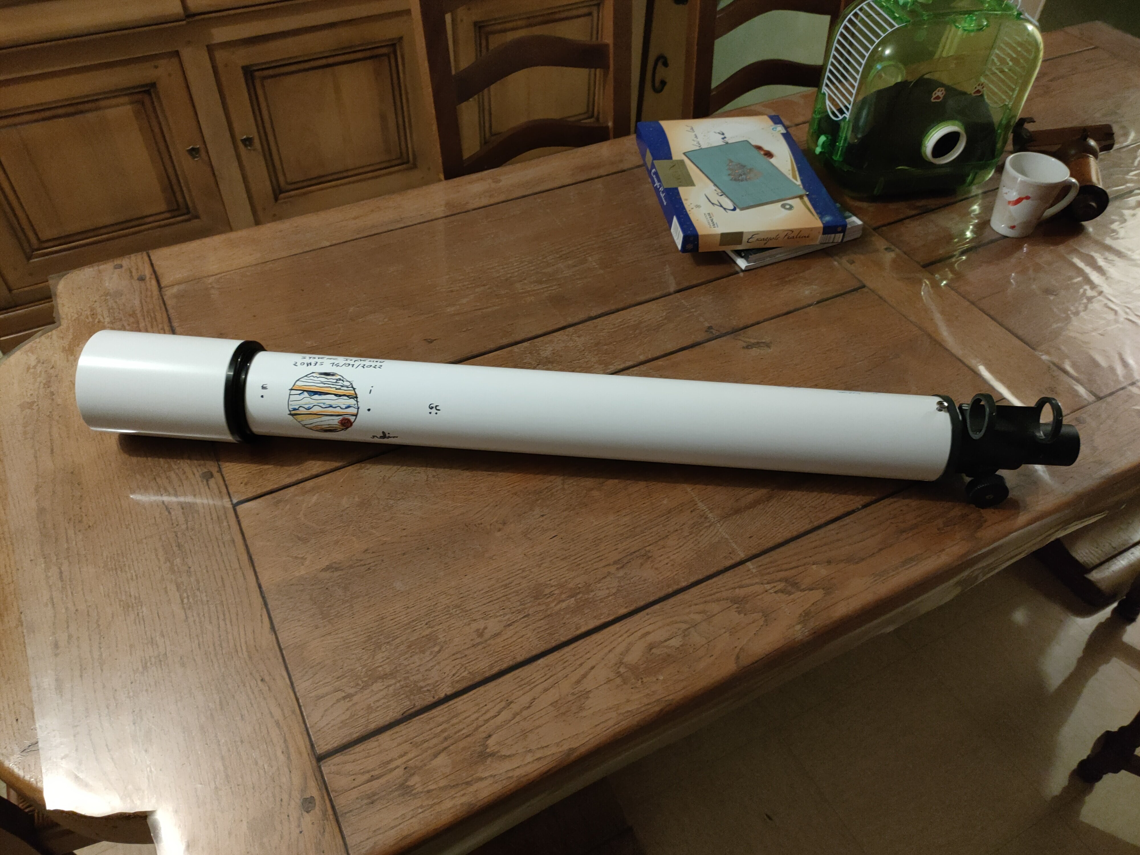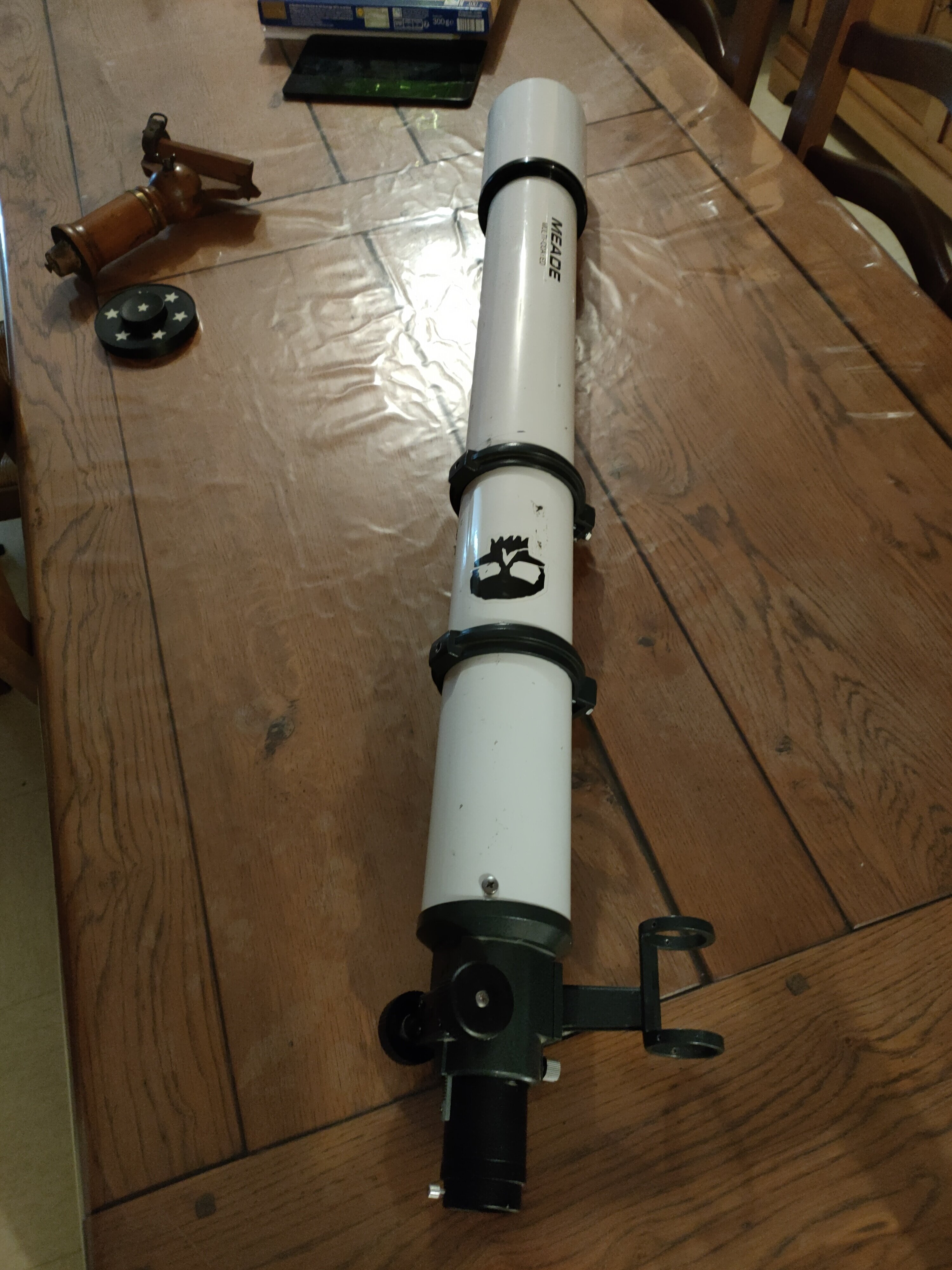 Jorris Posté 13 janvier 2022 Auteur Posté 13 janvier 2022 Yo le club Voyez, ce que j'ai récupéré, 3 ans et demi apres l'autre, j'en ais retrouvé une. 395 (équatoriale) ou 390 (azimutale) Meade 90 1000 En assez mauvais etat, je l'ais échangé contre une malle de transport. Un collier cassé, crémaillère bloqué, optique impactés sur les bords (surement un serrage excessifs), traitement optique atténuer (il serait difficile apparement d'en trouver une avec un traitement en grande forme, d'après ce que j'ai lu). Mais bon voila, l'optique reste en bon etat mise a part les impacts sur les bords, et se traitement a moitié atténué, pas de rayure. J'ai commencé par revoir la crémaillère, l'ancien utilisateur avait mis un espèce de scotch épais qui s'était enroulé a l'intérieur et avait tout bloqué. Apres un nettoyage et une double épaisseur de velours au bon endroit, je retrouve une crémaillère tout a fait fluide, avec seulement un micro-jeux, sans point dur. Pas la peine de la changer, elle fera bien le job. J'ai aussi redressé la molette de map avec son axe, complètement tordu. Ca m'a pris un peu de temps pour redresser pil poil dans l'axe, mais c'est ok.