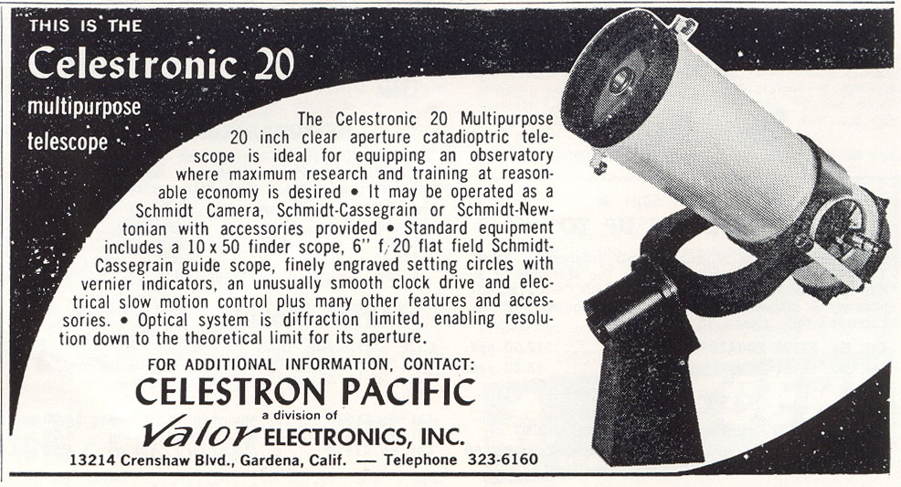 staffy Posté 24 juillet 2018 Posté 24 juillet 2018 Il y a 10 heures, ouki a dit : Un peu de fun en vrac c'est bien tout l'intérêt de ce post Alors, voici la série des Celestron Pacific : 1er rang : - sur la table : C 8 et C 4 OTA - à gauche : C 10 et C 6 2me rang : - C 12, C 16 et C 22 Les 16 et 22 étaient avant tout des instruments d'observatoires (comme également le C 20) avec des tarifs "astronomiques". En 1965, le C22 était vendu "au prix d'ami" de 74 000 $ soit, actualisé en tenant compte de l'inflation, environ 189 000 $ C'était tout de même un bel engin ... Pour en savoir plus sur les Celestron Pacific: http://www.astrosurf.com/bayle/temp/Vintage Celestron Telescopes.pdf