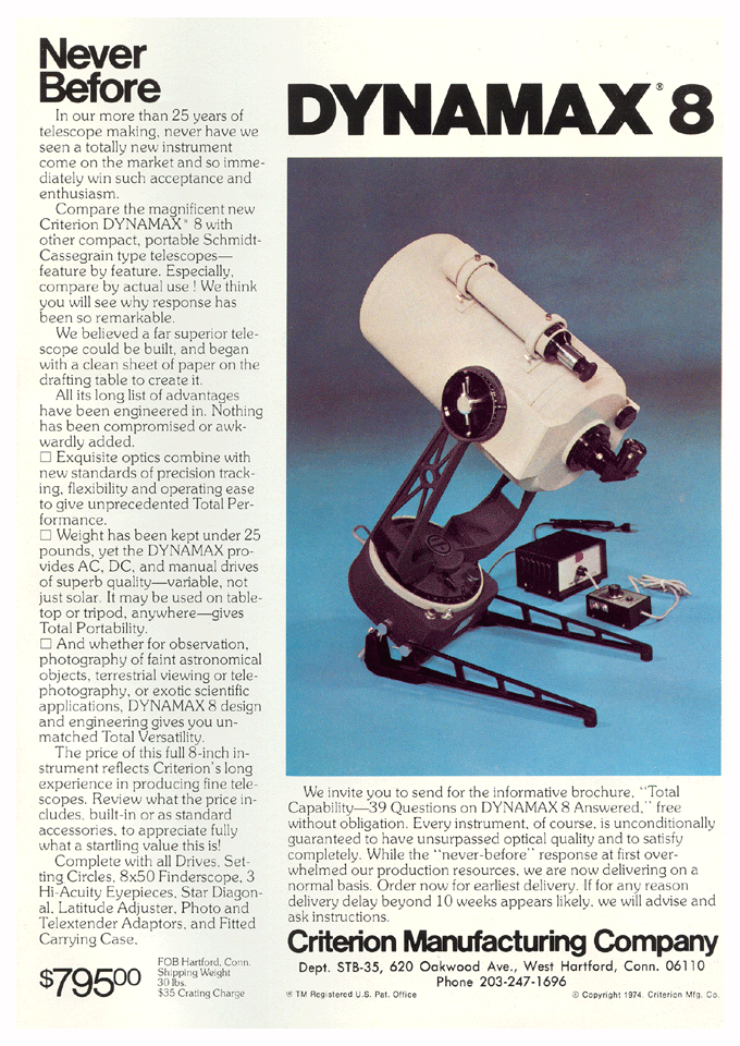 staffy Posté 22 juillet 2018 Posté 22 juillet 2018 Pour changer (radicalement) de sujet, le S.C 8 " à éviter : le Criterion DYNAMAX 8. Dans le début des années 1970, lorsque le Celestron 8 a trouvé sa place sur le marché, Criterion qui voyait ses ventes diminuer a rapidement proposé un clone mal conçu du C 8 avec une mauvaise optique et une monture encore pire. Ce "flop" a conduit l'entreprise au bord de la faillite. Bausch et Lomb, venu à la rescousse, a essayé de relancer le DYNAMAX mais le mal était fait et cette série a été assez rapidement abandonnée. Cela étant, ne pas oublier que Criterion a produit de très bons instruments (tels que les RV 6 et RV 8) qui n'avaient rien à voir avec ce DYNAMAX .