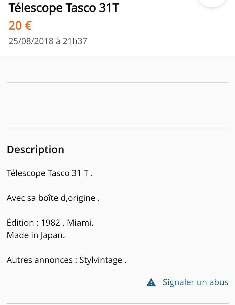 jgricourt Posté 2 août 2018 Posté 2 août 2018 "Il a été enregistré correctement et l'optique sont remarquablement belle placage et entièrement revêtue du bord sans aucune infiltration de moisissures. Cette unité n'a pas besoin d'être re-miroir comme de nombreux premiers modèles. Il est entièrement fonctionnel, y compris le système d'entraînement et si elles sont conservées dans l'état actuel peut être utilisé période indéterminée. Livré avec un oculaire 40x et 40x80." Beaucoup trop de fautes de français cela fait penser à un copier / collé d'une annonce d'un site US traduit par Google donc pour moi c'est une arnaque.