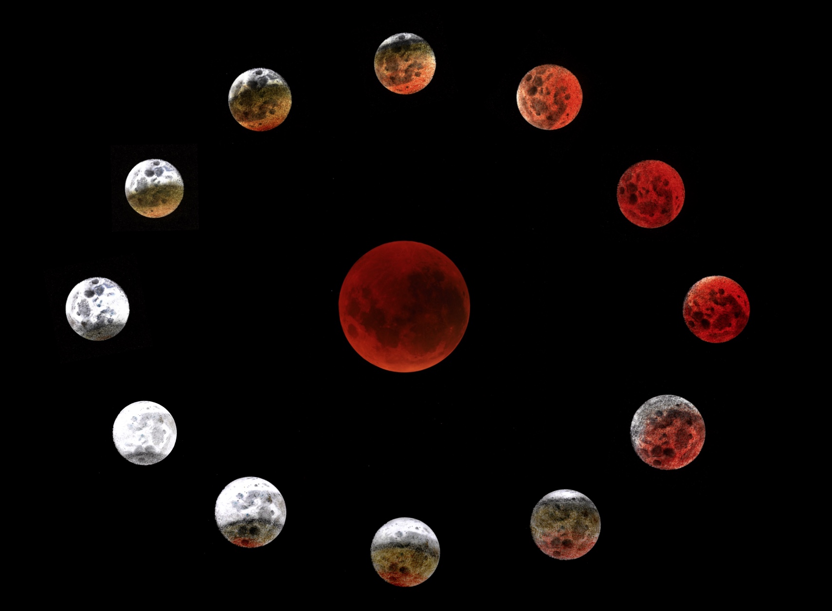 Eclipse de Lune 2018 depuis L'Ile de La Réunion : photographies à la FC100 et chapelet de dessins.