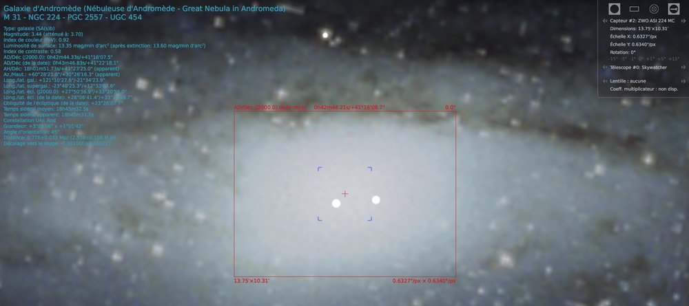 En revanche, elle n'est pas adaptée à la pose longue. Le temps de pose est assez limité. Maintenant, pour la pose longue, il te faudra aussi une caméra de guidage (à moins que tu utilises un diviseur optique) et là la 224 MC peut aussi servir à ça.