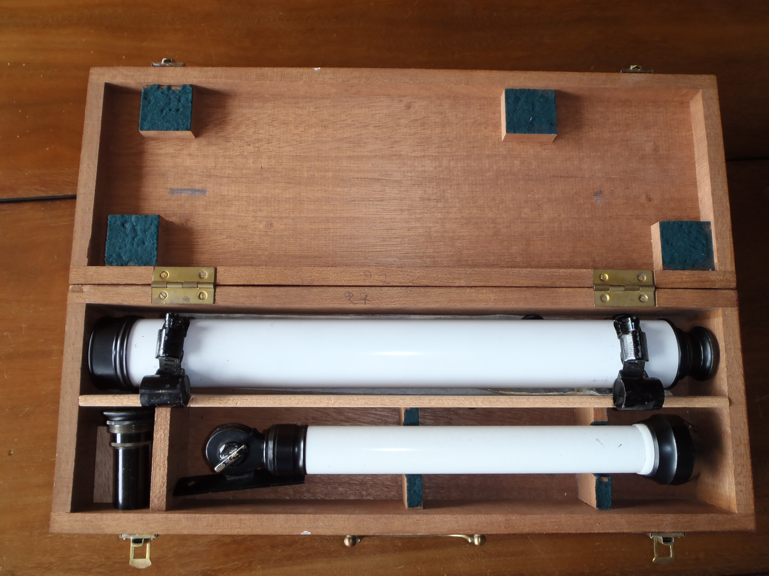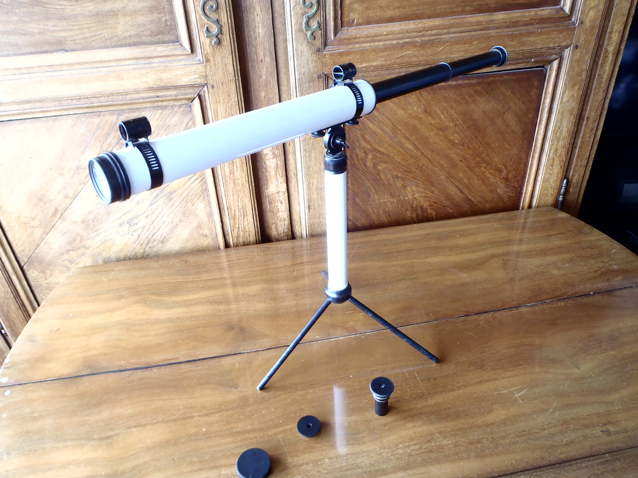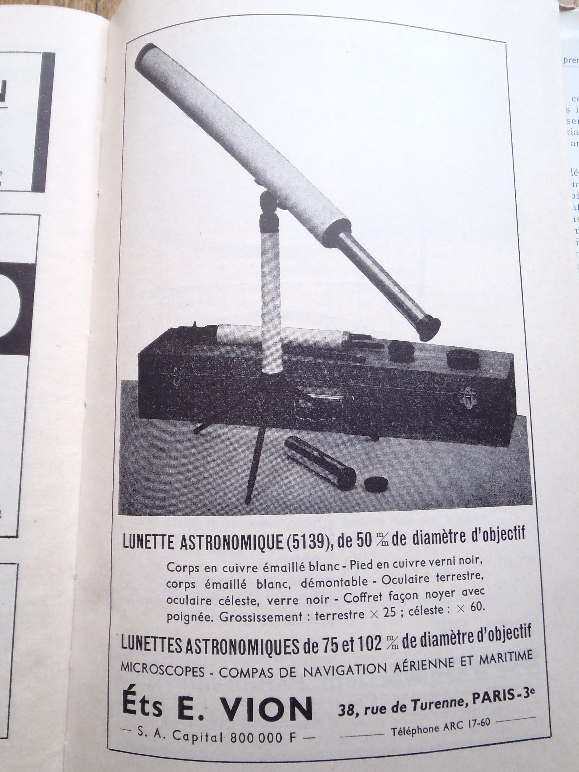 Jean-MiCiel Posté 10 août 2018 Posté 10 août 2018 Bonjour à tous, amis des anciennes et belles choses, Bon, et bien il n'y a pas de doute, la table de la salle à manger devient l'endroit le plus "hot" de l'appartement, car après la représentation de ma fine équipe Halley, voici que s'avance sur cette scène une concurrente qui a du métier, ma lunette VION, belle mensuration (50mm de diamètre!), dite "Lunette des Ecoles". La voici, la voilà, enfin non pas encore, car cette demoiselle semble timide et l'effeuillage risque de durer un moment!... Tout d'abord, comme de normal, l'extérieur, son coffret (comme dit la pub qui va suivre, "façon noyer"), plus que joli, et qui nécessite un entretien régulier... Vraiment, certaines belles choses ont disparu de nos jours! Souvent, nos instruments modernes n'ont même plus de contenant; et quand il existe, vous ne me contredirez pas si j'affirme que, bien que fort protecteur, le polystyrène est un tout petit peu moins "glamour"... Bon, alors donc, la voici, la voilà:, encore alanguie dans son coffret, mais vous l'avouerez, un aspect déjà plus que sympathique! Et quant la demoiselle daigne à prendre une position plus décente, désolé, moi, je tombe sous le charme... Que ce soit par "l'avant"... Ou par "l'arrière"... Et pour ne rien vous cacher de sa splendeur passée, sachez tout de même, amis des anciennes et belles choses, que cette dame savait à sa grande époque attirer le chaland, euh, je veux dire l'astronome, en tout bien tout honneur, en faisant elle-même sa réclame dans les plus distingués supports! Telle celle-ci, parue dans la "Revue des Constellations" de Sagot et Texereau, datant de 1963: J'étais certes né en 1963, mais quand même un peu jeune (quoique?...) pour m'intéresser à cette demoiselle! Non, j'ai franchi le pas il y a 2 ans bientôt, en devenant acquéreur (quel vilain mot pour une telle relation…) aux enchères pour 50 euros… Et comme vous le voyez, je n'étais pas le premier "amoureux", car le précédent (ou un des précédents…) a eu l'intelligence et la délicatesse de la parer de deux bijoux: 2 mires, qui à défaut de chercheur sont bien utiles pour viser l'objet terrestre ou céleste désiré! Vous remarquerez également l'astuce de la fabrication, qui a d'ailleurs été reprise par nos chères amies Perl Halley 70 et 80: les trépieds se rangent dans la colonne, ce qui facilite grandement le transport. Quant à la qualité des images, elle est au rendez-vous. La mise au point se fait par translation de l'oculaire; son utilisation est très agréable en terrestre, mais beaucoup moins en céleste, car dès que l'objet s'éloigne un tant soit peu trop de l'horizon, les cervicales, à défaut de renvoi coudé, sont mises à rude épreuve. Mais je vous avouerais honnêtement que je pense que sur ce forum, quelques astrams doivent être mieux placés que moi pour parler de cette dame (elle revient de temps en temps se faire admirer dans des conversations): je n'utilise que l'oculaire qui je pense est terrestre (25x), et n'ai pas été "foutu" d'utiliser le céleste que je n'arrive pas à intégrer dans ce puzzle de pièces. La dame résiste, mais j'ai bon espoir! Voilà! Si des amoureux, transis ou non, passent par ici, ils sont plus que les bienvenus pour évoquer de doux souvenirs... JM 2
