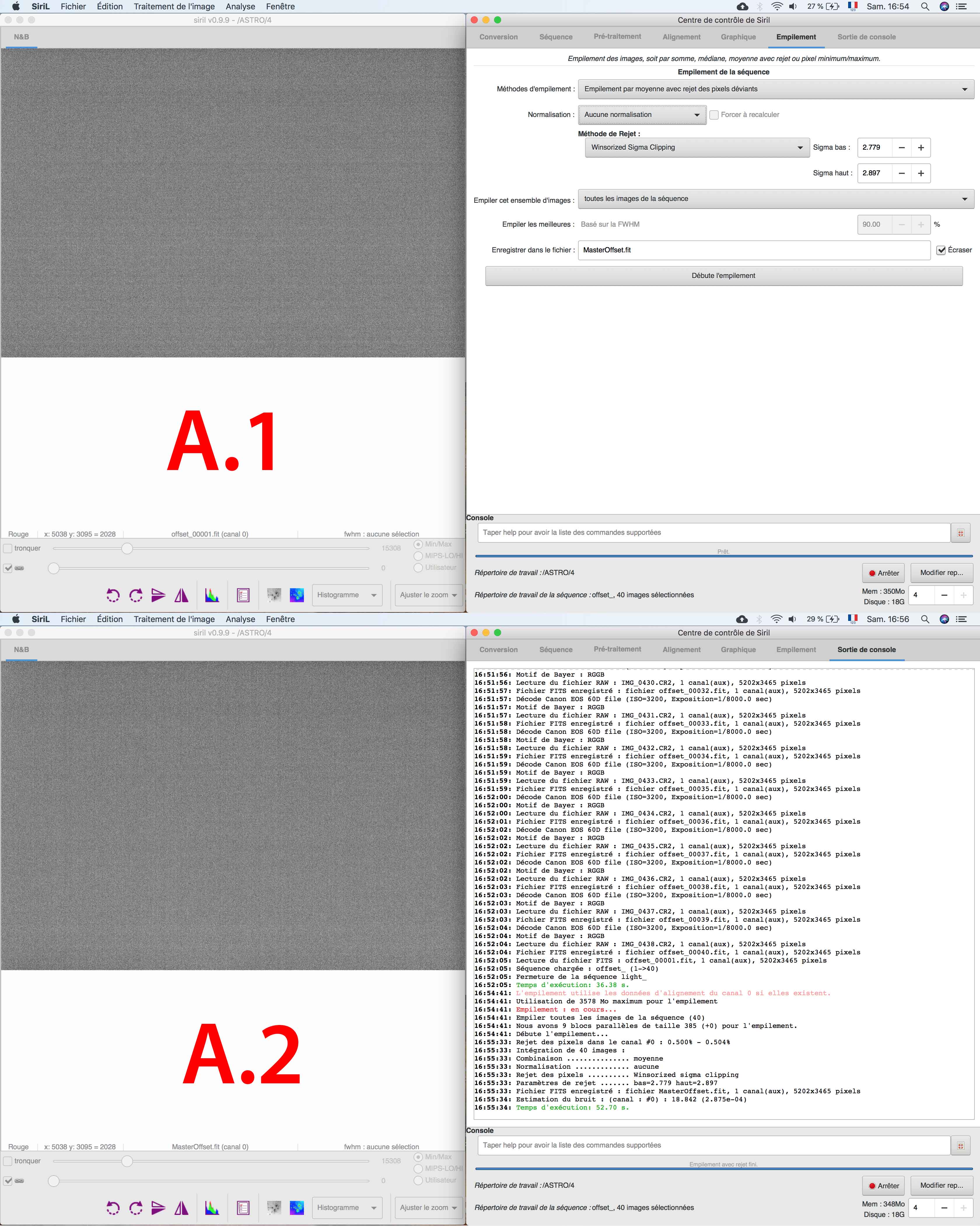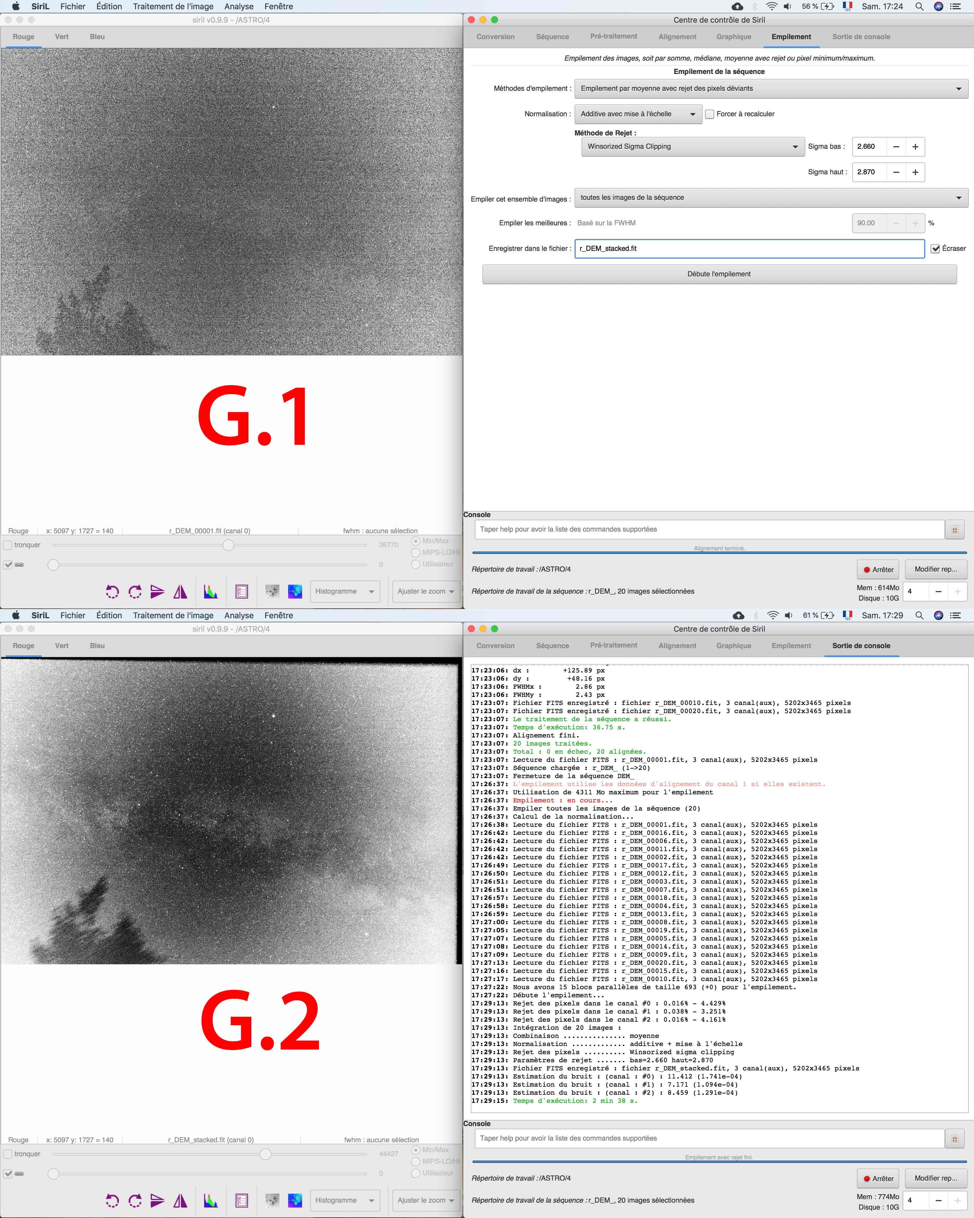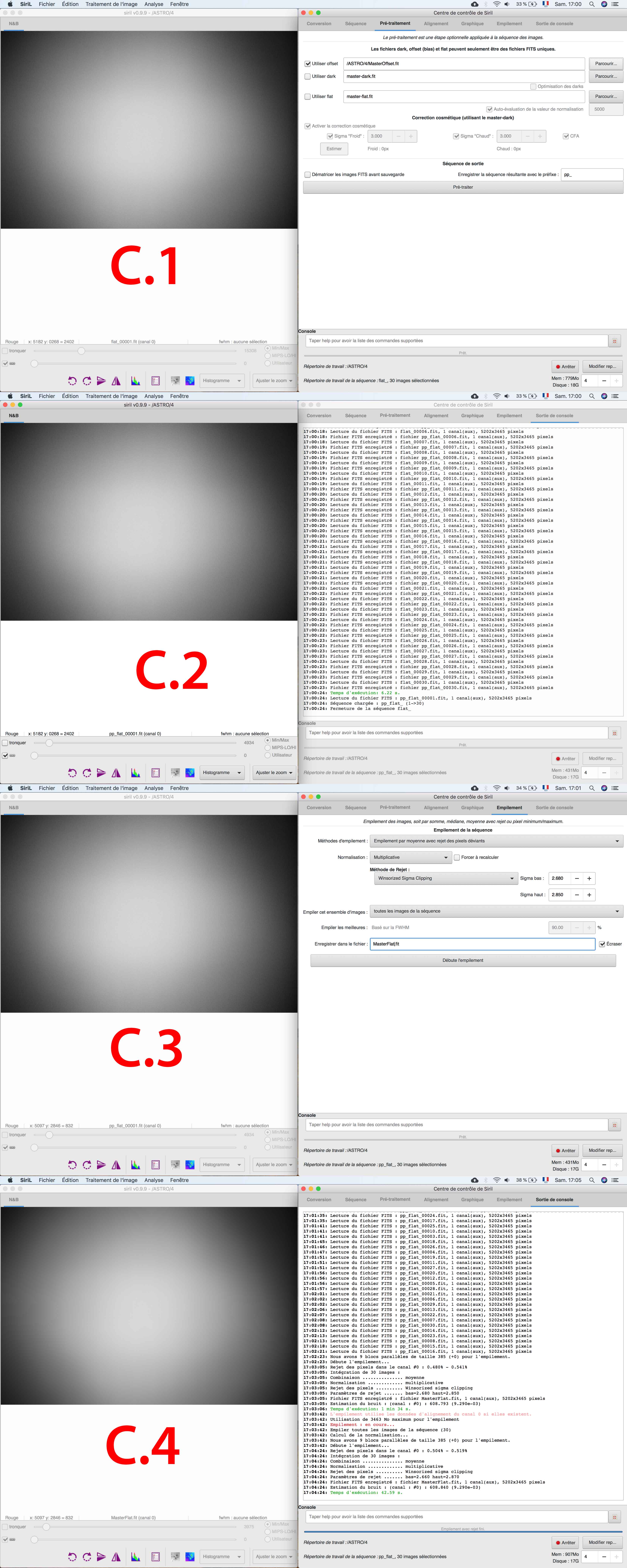 VVB Posté 11 août 2018 Posté 11 août 2018 (modifié) Bonjour à tous, Suite à ma première session d’astrophotograhie, j’ai du faire quelque chose de mal puisque mon pré-traitement ne marche pas bien J’utilise un APN (canon 60D non defiltré) en fixe avec un 18mm. Voici mes réglages le tout fait la même nuit et même position de l’appareil. 20 x LIGHT : 18mm / 3200ISO / F5 / 10s 30 x DARK : 18mm / 3200ISO / F5 / 10s (avec le cache de l’optique juste après la prise des LIGHTS) 30 x FLAT : 18mm / 3200ISO / F5 / 1/1000s (optique proche de l’écran de mon ordinateur sur une image blanche, et histogramme au 2/3 ) 40 x OFFSET : 18mm / 3200ISO / F8 / 1/8000s (avec le cache de l’optique juste après la prise des FLAT) J’utilise Siril pour faire les traitements mais avant je check toute les images pour voir si il n’y a pas d’image inutilisable ou ayant un problème. Je commence donc : Je convertis Dark Flat Offset et Light en fit et séquence. Je charge ma séquence OFFSET et j’empile (EMPILEMENT par moyenne avec rejet pixel déviants / AUCUNE normalisation / Winsorized Sigma Clipping ) et je règle mon Sigma bas et haut pour être autour de 0.5%. (A.1) J’ai mon MasterOffset (A.2) Même chose pour faire le MasterDark ( B.1 & B.2) je charge ma séquence FLAT, je prétraite avec mon MasterOffset ( C.1 & C.2 ) Puis j’empile ma séquence pp_Flat (EMPILEMENT par moyenne avec rejet pixel déviants / normalisation MULTIPLICATIVE / Winsorized Sigma Clipping ) en réglant les Sigma bas et haut (autour de 0.5%) ( C.3 ) J’ai donc mon MasterFlat ( C.4 ) Je charge ma séquence LIGHT que je préretraite avec le MasterDark et le MasterFlat. Je fais une estimation des pixel chaud et froid (par contre je ne règle pas trop ce paramètre car je ne sais pas s’il faut le changer si le chiffre n’est pas rouge. En tout cas il est au dessus de 10.000 en pixel chaud, j’ai aussi testé en changeant le sigma « chaud » pour être en dessous de 10.000, mais pas de différence visible pour moi). ( D.1 ) J’ai donc mes pp_light (je commence à voir mon problème (mes pp_light ont l’air trop corriger par le MasterFlat ) (D.2 ) Je dématrice mes pp_light et j’appel ça « DEM » ( E.1 & E.2 ) J’aligne mes DEM (F.1 & F.2) Puis j’empile mes « r_dem » (EMPILEMENT par moyenne avec rejet pixel déviants / Normalisation ADDITIVE avec mise à l’échelle / Winsorized Sigma Clipping ) Je ne touche pas aux réglages Sigma Haut et Bas mais je devrais peut-être ? Quel canal faut-il que je regarde pour régler ces Sigma ? Je dois faire une moyenne ? ( G.1 ) J’ai donc mon image finale pré-traité… mais je vois mon MasterFlat très clair dans cette image finale… Qu’est ce qui ne va pas ? Pour info j’ai mesurer mes Flat et ils ne saturent pas mais sont-ils bien exposé ? Peut-Être trop sombre ? ( H.1 ) J’ai testé aussi avec un 500D et un autre optique, j’ai toujours le même soucis. Je pense donc que c’est mon protocole de prise de FLAT qui ne marche pas, ou mon pré-traitement. Qu’en pensez-vous ? Modifié 11 août 2018 par VVB