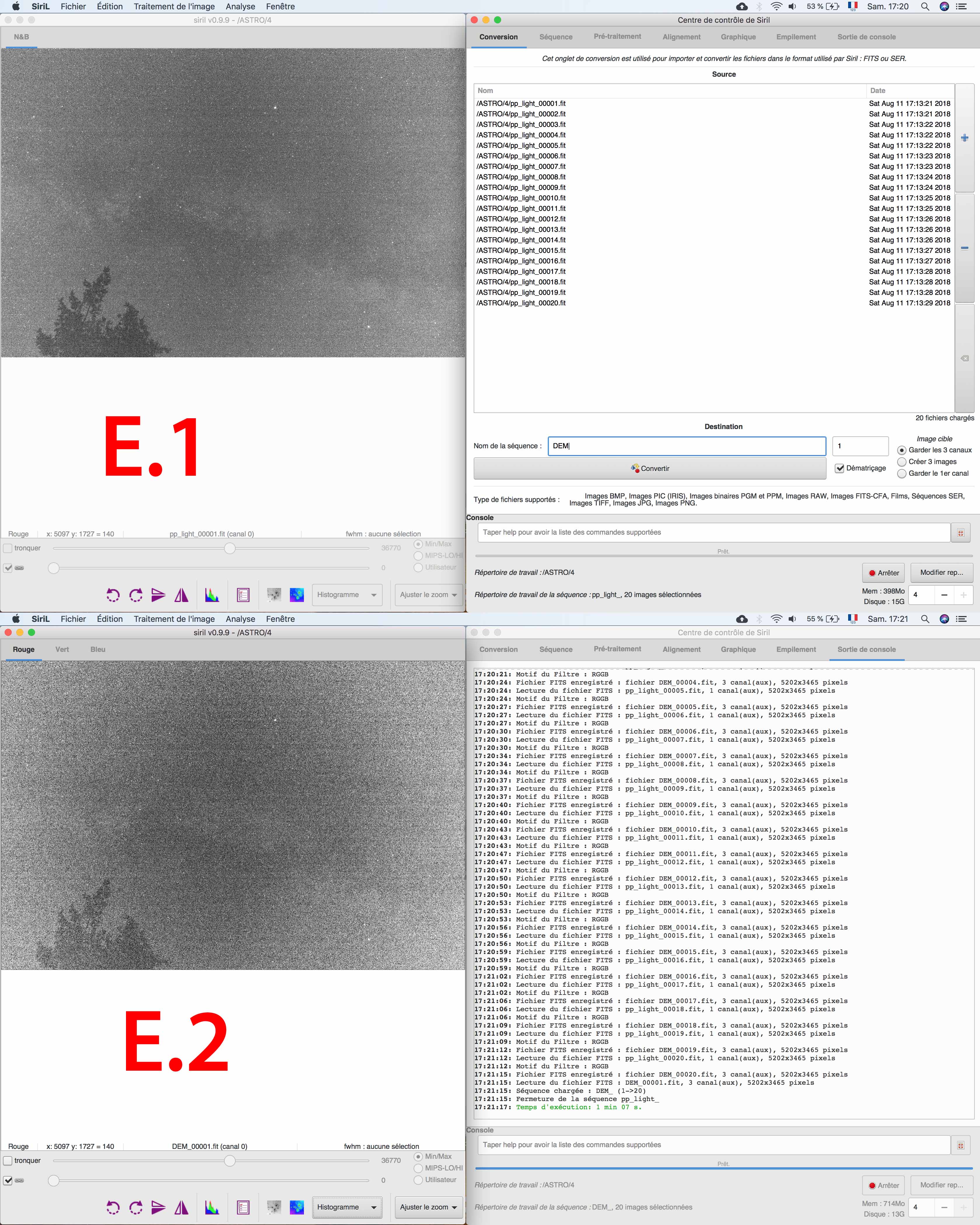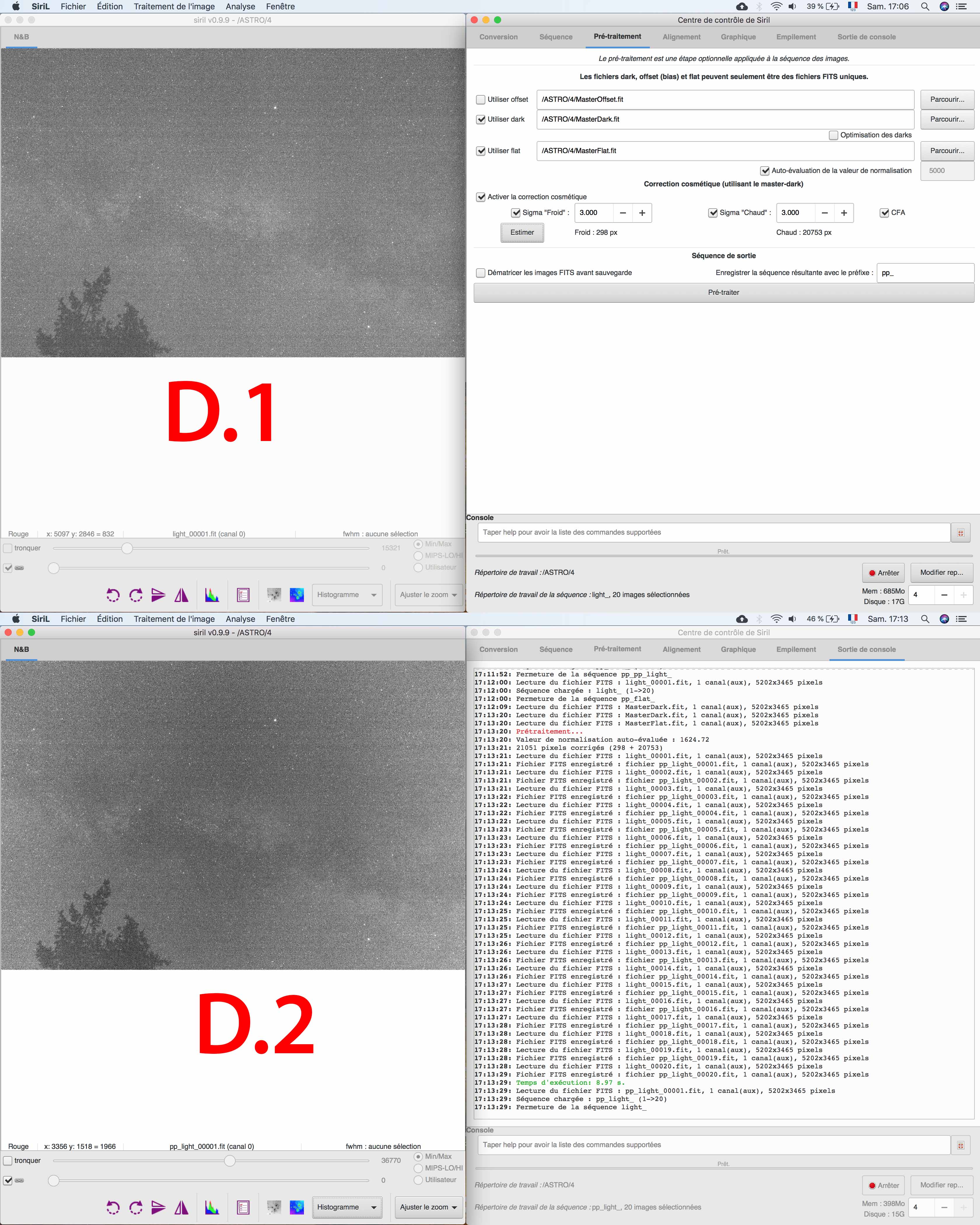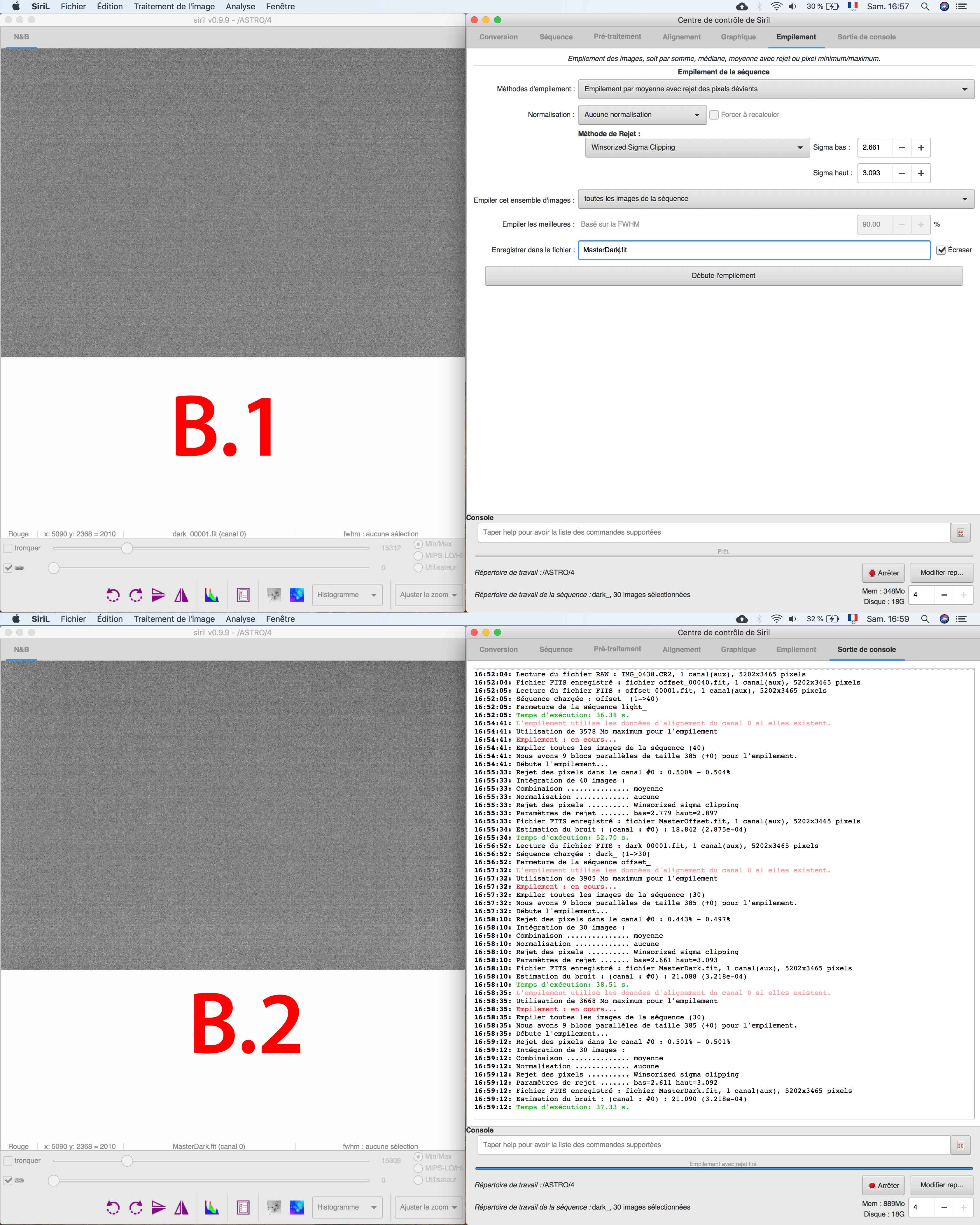 VVB Posté 11 août 2018 Posté 11 août 2018 (modifié) Bonjour à tous, Suite à ma première session d’astrophotograhie, j’ai du faire quelque chose de mal puisque mon pré-traitement ne marche pas bien J’utilise un APN (canon 60D non defiltré) en fixe avec un 18mm. Voici mes réglages le tout fait la même nuit et même position de l’appareil. 20 x LIGHT : 18mm / 3200ISO / F5 / 10s 30 x DARK : 18mm / 3200ISO / F5 / 10s (avec le cache de l’optique juste après la prise des LIGHTS) 30 x FLAT : 18mm / 3200ISO / F5 / 1/1000s (optique proche de l’écran de mon ordinateur sur une image blanche, et histogramme au 2/3 ) 40 x OFFSET : 18mm / 3200ISO / F8 / 1/8000s (avec le cache de l’optique juste après la prise des FLAT) J’utilise Siril pour faire les traitements mais avant je check toute les images pour voir si il n’y a pas d’image inutilisable ou ayant un problème. Je commence donc : Je convertis Dark Flat Offset et Light en fit et séquence. Je charge ma séquence OFFSET et j’empile (EMPILEMENT par moyenne avec rejet pixel déviants / AUCUNE normalisation / Winsorized Sigma Clipping ) et je règle mon Sigma bas et haut pour être autour de 0.5%. (A.1) J’ai mon MasterOffset (A.2) Même chose pour faire le MasterDark ( B.1 & B.2) je charge ma séquence FLAT, je prétraite avec mon MasterOffset ( C.1 & C.2 ) Puis j’empile ma séquence pp_Flat (EMPILEMENT par moyenne avec rejet pixel déviants / normalisation MULTIPLICATIVE / Winsorized Sigma Clipping ) en réglant les Sigma bas et haut (autour de 0.5%) ( C.3 ) J’ai donc mon MasterFlat ( C.4 ) Je charge ma séquence LIGHT que je préretraite avec le MasterDark et le MasterFlat. Je fais une estimation des pixel chaud et froid (par contre je ne règle pas trop ce paramètre car je ne sais pas s’il faut le changer si le chiffre n’est pas rouge. En tout cas il est au dessus de 10.000 en pixel chaud, j’ai aussi testé en changeant le sigma « chaud » pour être en dessous de 10.000, mais pas de différence visible pour moi). ( D.1 ) J’ai donc mes pp_light (je commence à voir mon problème (mes pp_light ont l’air trop corriger par le MasterFlat ) (D.2 ) Je dématrice mes pp_light et j’appel ça « DEM » ( E.1 & E.2 ) J’aligne mes DEM (F.1 & F.2) Puis j’empile mes « r_dem » (EMPILEMENT par moyenne avec rejet pixel déviants / Normalisation ADDITIVE avec mise à l’échelle / Winsorized Sigma Clipping ) Je ne touche pas aux réglages Sigma Haut et Bas mais je devrais peut-être ? Quel canal faut-il que je regarde pour régler ces Sigma ? Je dois faire une moyenne ? ( G.1 ) J’ai donc mon image finale pré-traité… mais je vois mon MasterFlat très clair dans cette image finale… Qu’est ce qui ne va pas ? Pour info j’ai mesurer mes Flat et ils ne saturent pas mais sont-ils bien exposé ? Peut-Être trop sombre ? ( H.1 ) J’ai testé aussi avec un 500D et un autre optique, j’ai toujours le même soucis. Je pense donc que c’est mon protocole de prise de FLAT qui ne marche pas, ou mon pré-traitement. Qu’en pensez-vous ? Modifié 11 août 2018 par VVB