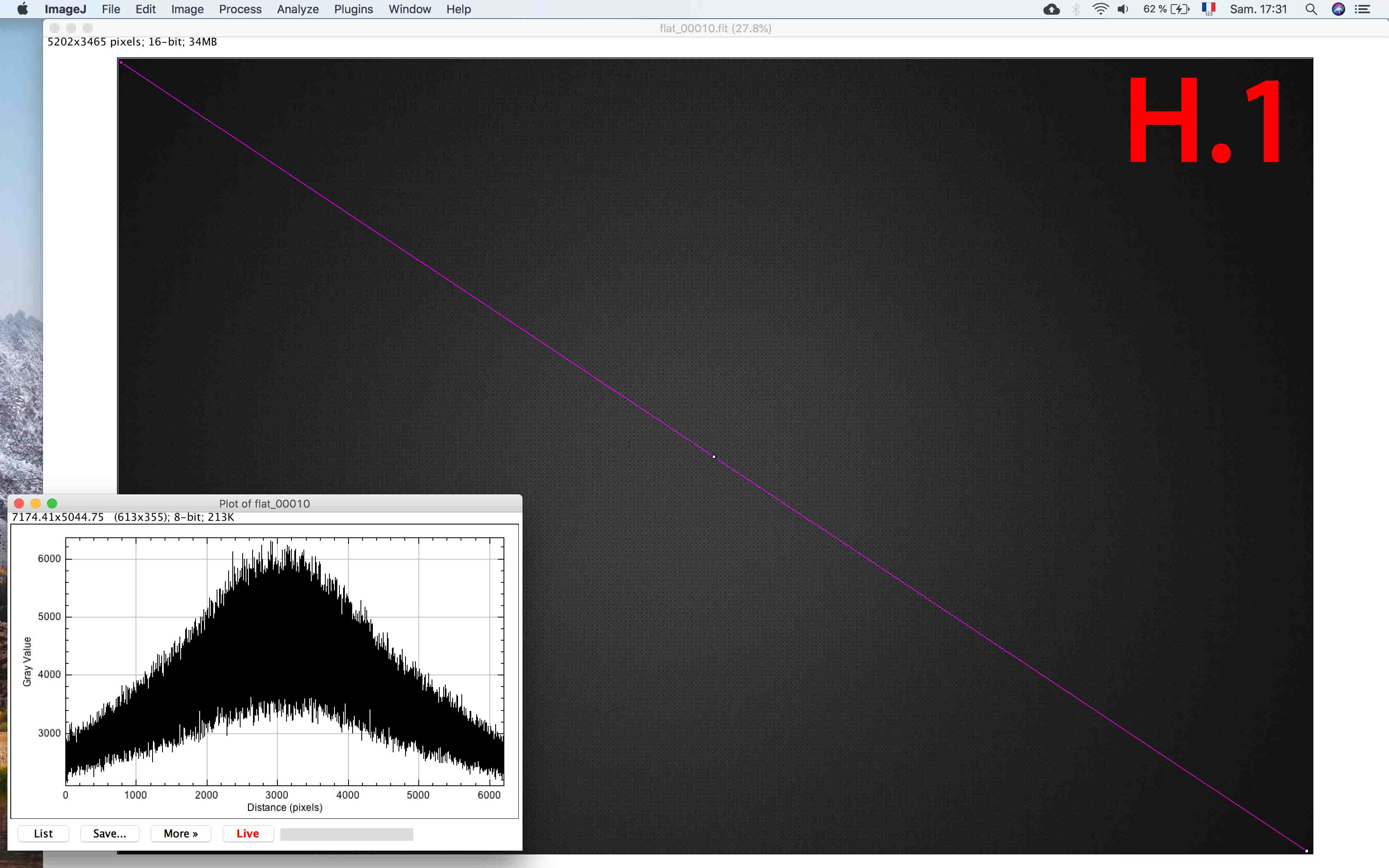 VVB Posté 12 août 2018 Auteur Posté 12 août 2018 (modifié) Merci Laurent pour tes conseils. Je vais refaire mes flat et aussi je me demande si il n'y a pas la trame de mon ecran sur mes flat... je vais les faire autrement et tester aussi differentes exposure car quand je les expose je place le coté droit du signal sur le coté droit de mon histogramme avant que ça sature. Voici l'histogramme quand je prends mes flat. Je trouve que c'est un signal tres allongé alors que la surface filmé est uniforme (c'est du au vignetage il me semble) PS : la trame visible sur la photo de l'histogramme est la trame de l'écran arrière du 60D Modifié 12 août 2018 par VVB