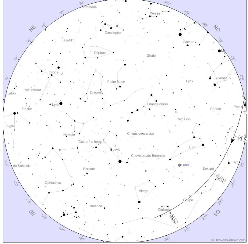 Trajectoire et horaires notées depuis Heavens Above avant la chute, vive les captures d’écran.
