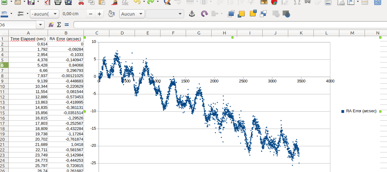 gehelem Posté 22 août 2018 Posté 22 août 2018 Salut, ça faisait un moment que je voulais mesurer l'erreur périodique de mon EQ6, surtout après l'avoir démontée et re-graissée. Sauf que voilà, les seules options pratiquées c'est en passant par PHD2 Je n'ai rien contre, mais j'aime bien faire joujou. Donc, zyva avec Ekos. L'astuce c'est de décocher tout ça après avoir calibré et enclenché le suivi : Comme ça le guideur se contente de mesurer les dérives J'ai fait une petite vidéo pour montrer tout ça : Après, il suffit d'exporter les données avec la disquette : On récupère un fichier qui contient toutes les dérives, avec un horodatage. Après, un petit graphique sur Calc (Excel sur Linux) Moi ça donne ça : Vous allez me dire, c'est pas brillant... Certes. Il faut surtout que je m'explique cette dérive constante qui me fait irrémédiablement perdre (ou avancer...) de 20'' en RA au bout d'une heure. Sinon, au delà de cette dérive à la con, ça reste bien entre -5" et +5", classique sur une (vieille) EQ6 si j'ai bien pigé. Je vais laisser tourner plus longtemps pour voir si ça revient (et ce serait chiant parce que ce seraient mes VSF qui sont en cause) Et aussi pour chercher les "axes de progression" pour améliorer tout ça. Je vais relire le post de @pagpatrice sur le dentifrice. Gilles. Edit : Mais je suis un imbécile !! Cette dérive provient aussi de mon erreur de mise en station !! 1