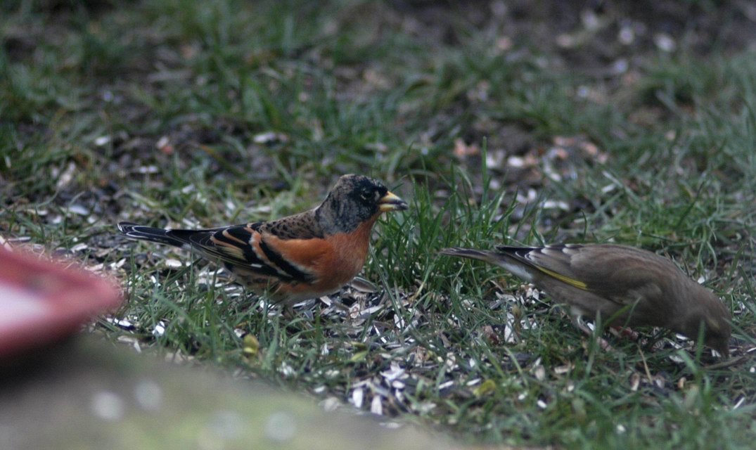 Un petit visiteur d'hiver ce jour dans mon jardin : le pinson du nord (ici en compagnie d'un verdier).