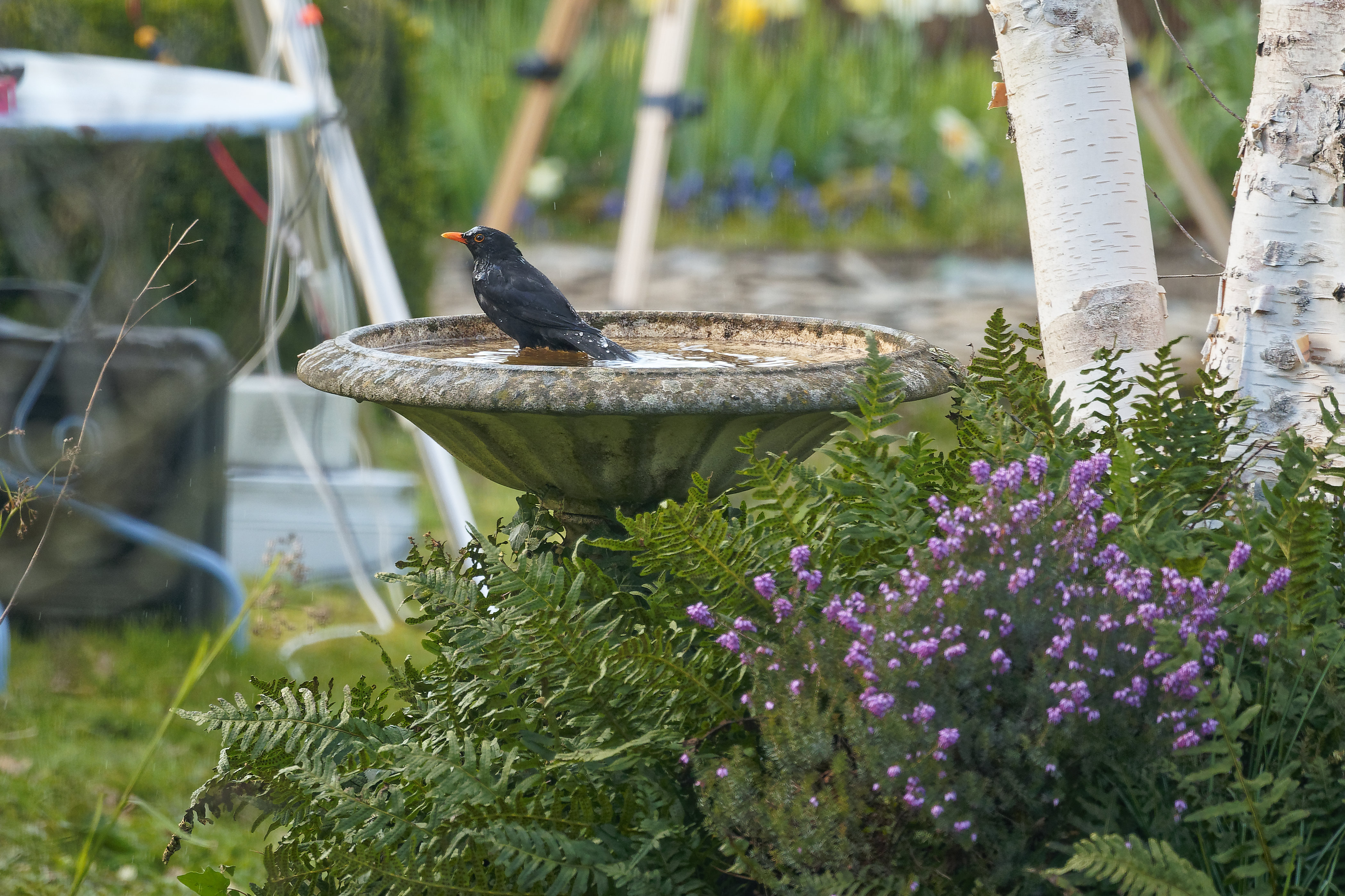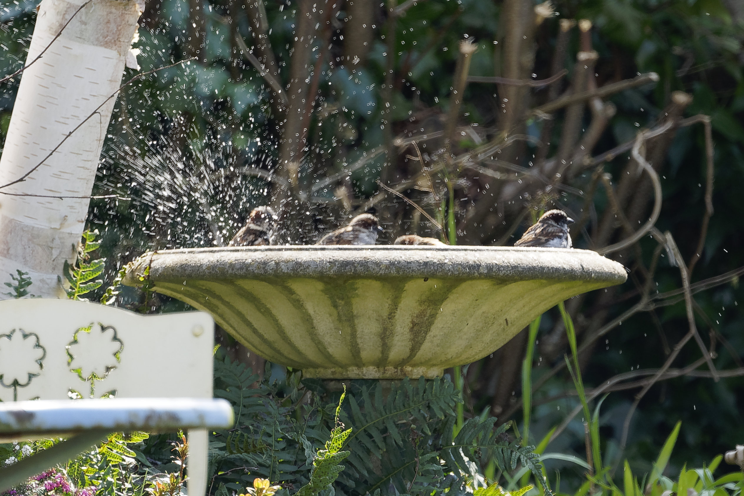 Ca se chamaille dans le cerisier, ça fait quotidiennement ses ablutions dans la piscine (même si on est à 1m50 en train de casser la croute!).