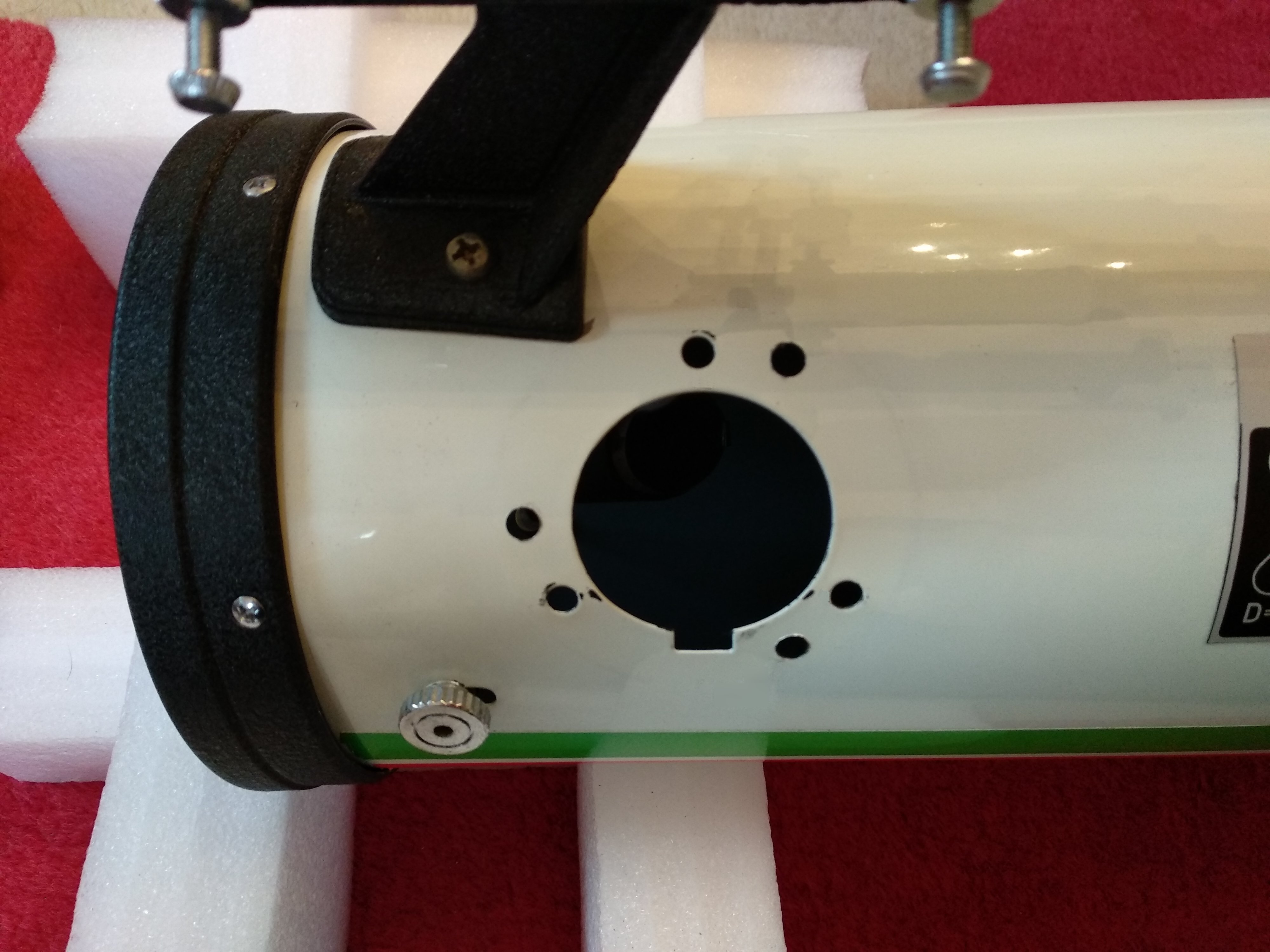 Le tube est calé sur du polystirène, le miroir primaire légèrement surélevé ; le primaire est entièrement enveloppé de chiffons, les futurs orifices sont recouverts d'adhésif transparent et un petit coup de pointeau devrait m'éviter de riper ; les forets sont, pour les plus longs, entourés d'adhésif pour ne pas aller trop profond.