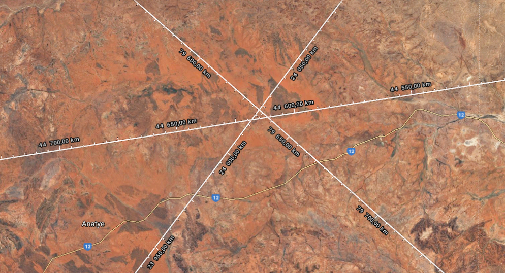 Il ne reste qu'à zoomer dans la zone où les 3 médianes se coupent, on arrive dans la région des Territoires du Nord, en Australie, vers Anatye, région parcourue par la Nationale 12.