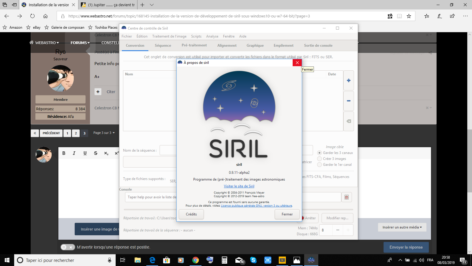 Ryo Posté 12 mars 2019 Posté 12 mars 2019 (modifié) Salut Michel lors de l'installation a un moment il te propose un choix il ne faut surtout pas le faire et par défaut il installe tous. Puis dans mon txt je n'est fais que recopier car le copier coller de Laurent de marchais pas et je me suis dit que la je ne le perdrais pas c'est bien a au premier ./autogen.sh car la ou j'ai écrit mise a jour il n'y a que les quelques lignes pour les faires et il faut faire cd siril avant le pull de mise a jours Il faut apparemment être dans le repertoire de siril d'où le cd siril avant La je vais faire la mise a jour pour tester les nouvelles fonctions Bienvenue au beta testeur pro que tu est Pour m'aider je garde le txt ouvert avec la premiere page de Laurent Modifié 12 mars 2019 par Ryo
