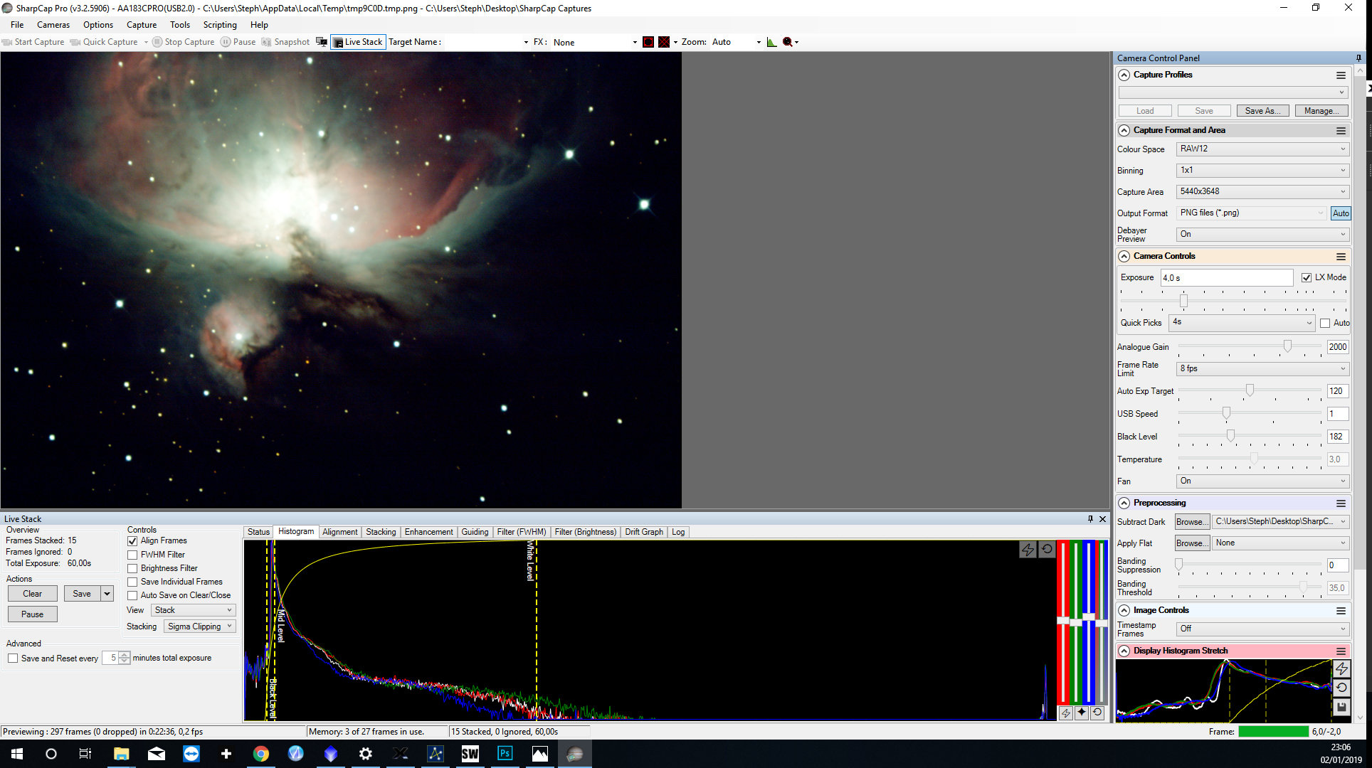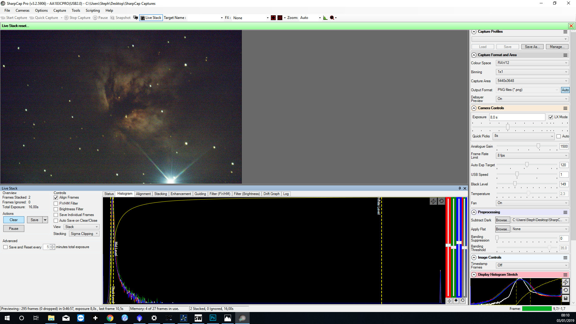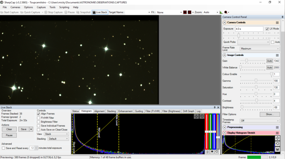 1. autostretch sur le mini histogramme le white level doit être le plus à droite possible