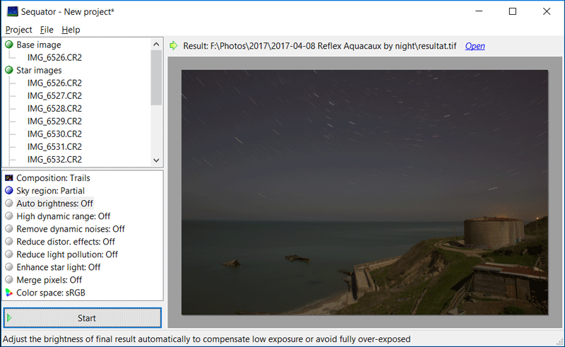 Fred_76 Posté 23 novembre 2018 Auteur Posté 23 novembre 2018 Deuxième leçon : faire un filé d'étoiles On va commencer par le plus simple, les filés d'étoiles. Sequator est particulièrement efficace dans ce genre de traitement. Dans la partie inférieure de la colonne de gauche, cliquer sur "Composition: Align stars" Vous verrez en dessous les options de la Composition, cochez alors sur "Trails" La commande "Composition" passe alors en mode "Trails" Pour que les filés d'étoiles aient un effet de comète, il faut cliquer la case "Motion effect". Laissez le reste des options par défaut et cliquez sur "Start" pour lancer le calcul Voilà, c'est aussi simple que cela ! Cochez la case "Motion effect" pour avoir un effet comète sur le filé d'étoiles. Après un certain temps de calcul, qui dépend du nombre d'images, de leur taille et de la puissance de traitement de votre ordinateur, Sequator affiche l'avancement du calcul et quand il est terminé le bouton "Cancel" se replace par "Close". Cliquez sur "Close" pour afficher l'image calculée : Voilà le résultat. Cliquez sur "Open" pour ouvrir la photo calculée dans l'éditeur par défaut des fichiers TIFF de votre ordinateur (chez moi c'est Photoshop CS2). Le résultat dépend maintenant des options supplémentaires choisies. On en reparle dans la troisième leçon. 1 2