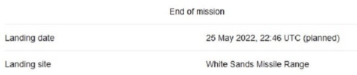 L'atterrissage aura lieu sur la zone militaire de White Sands Missile Range, (avec plusieurs sites disponibles sur la zone) . Tout doit être prêt pour sa réception.