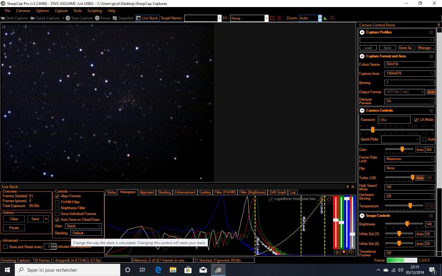 Ensuite, tu vises un objet assez brillant (un amas globulaire ? M42 ?) et tu poses les 5 secondes, sans stacker. Dans Sharpcap, tu affiches l'histogramme général (bouton en haut à droite dans la barre d'outils), et tu vérifies que la "bosse" est bien décollée de la gauche. Si ce n'est pas le cas, tu augmentes petit à petit le gain pour que cette bosse soit bien décollée. On trouve de tout comme réglages pour la 224 mais il semble que la plupart bossent avec des gains relativement élevés pour du ciel profond (entre 1/2 et 2/3 du gain maximum). Naivement, j'aurais eu tendance à démarrrer au gain unitaire (135) puis à augmenter, mais n'ayant pas l'expérience de cette caméra...